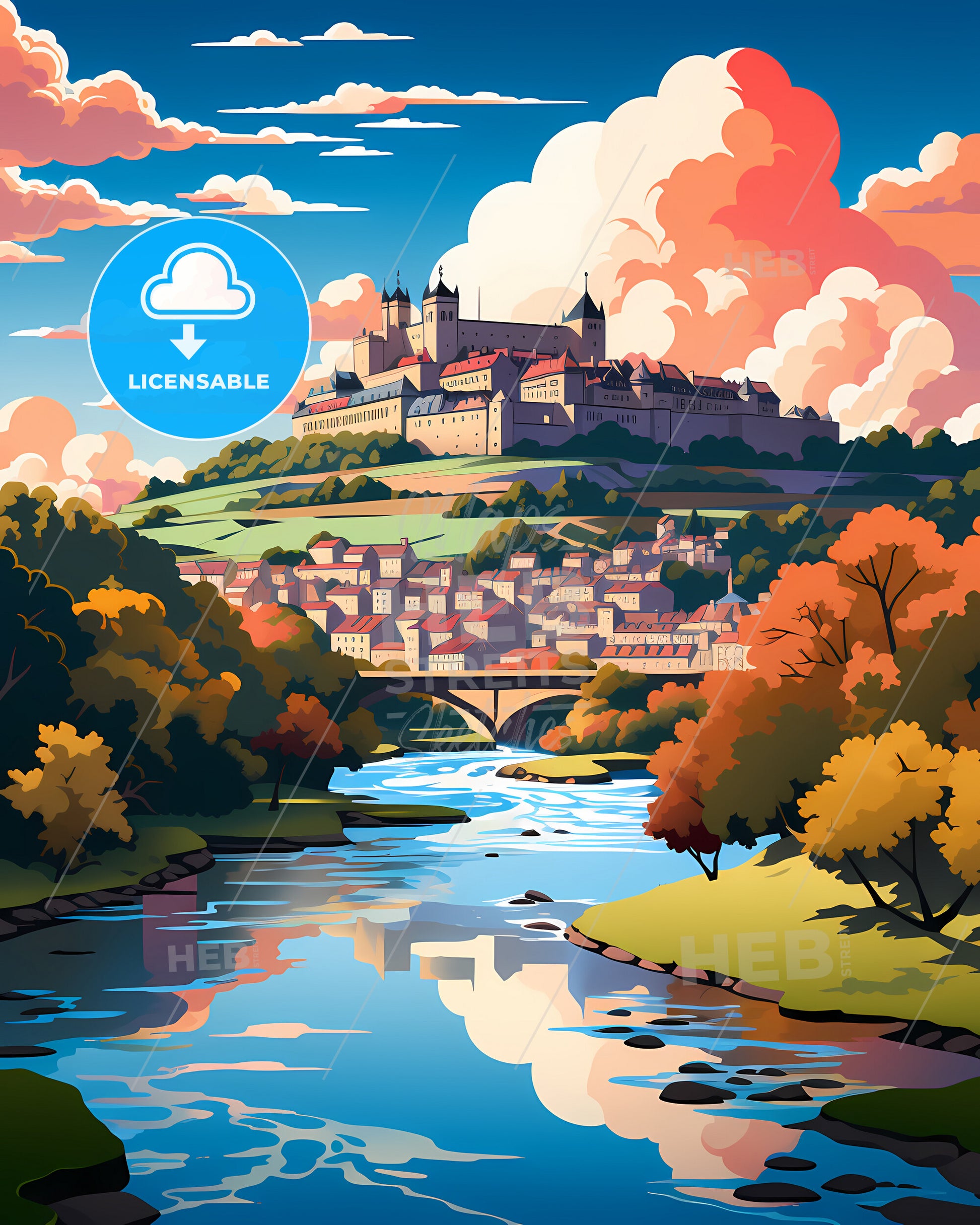 Streetart in Rennes, France. Urban city scene, Watercolor Painting, oil Painting, Colorful Art Painting, oil painting like paper art, travel art sunny day, in the style of pink and crimson, Beautiful white Cloud, Blue Sky Painting, Graphic excellence. Large area of copy space on top. dark Orange and retro Red, dark turquoise and yellow, minimal shading, panoramic View