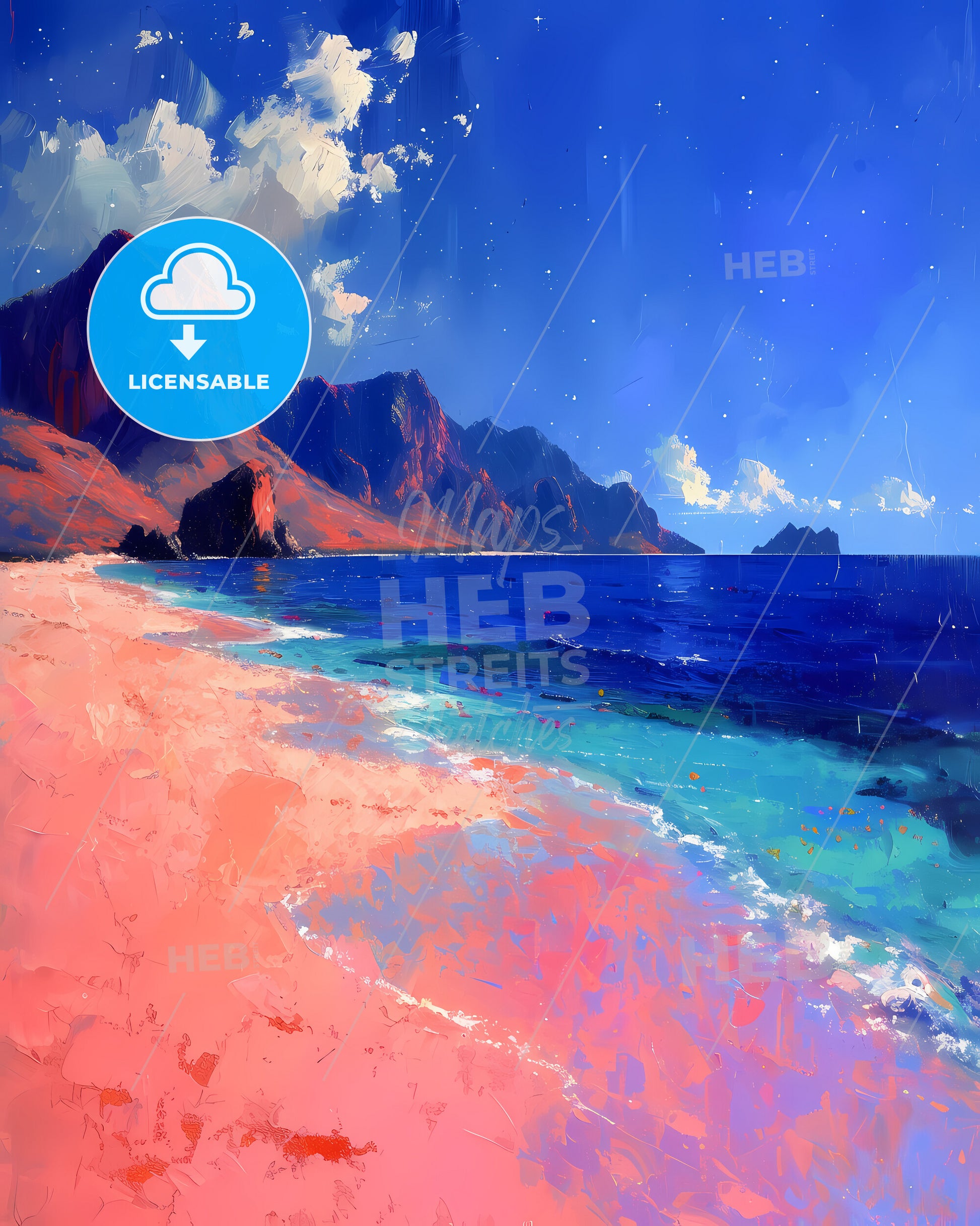 Komodo Island, Indonesia. Famous for its pink beaches and the Komodo Dragon, the largest lizard on Earth. Art painting with deep blue sky an a focus on the destination objective. Only some bright higher clouds in the distance. Style of impressionistic colorful painting made with acrylic colors, nice strokes and outlines. Large area of copy space on top. Some litte bright sparkles.