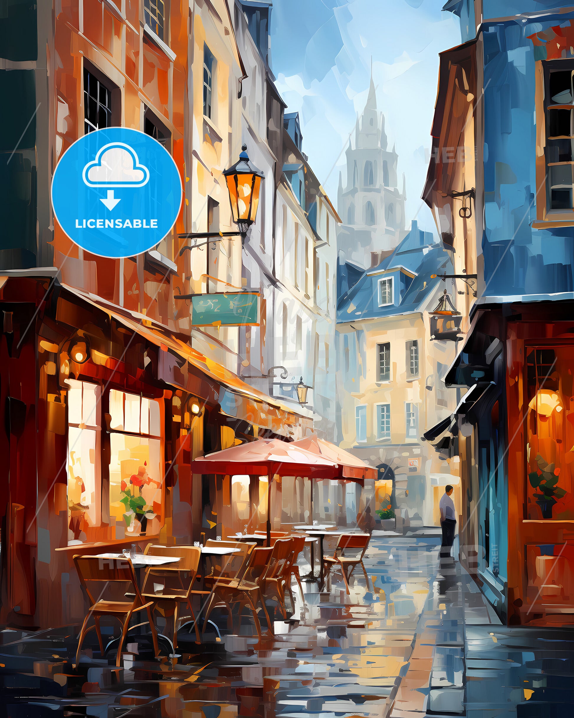 Streetart in Le Mans, France. Urban city scene, Watercolor Painting, oil Painting, Colorful Art Painting, oil painting like paper art, travel art sunny day, in the style of pink and crimson, Beautiful white Cloud, Blue Sky Painting, Graphic excellence. Large area of copy space on top. dark Orange and retro Red, dark turquoise and yellow, minimal shading, panoramic View