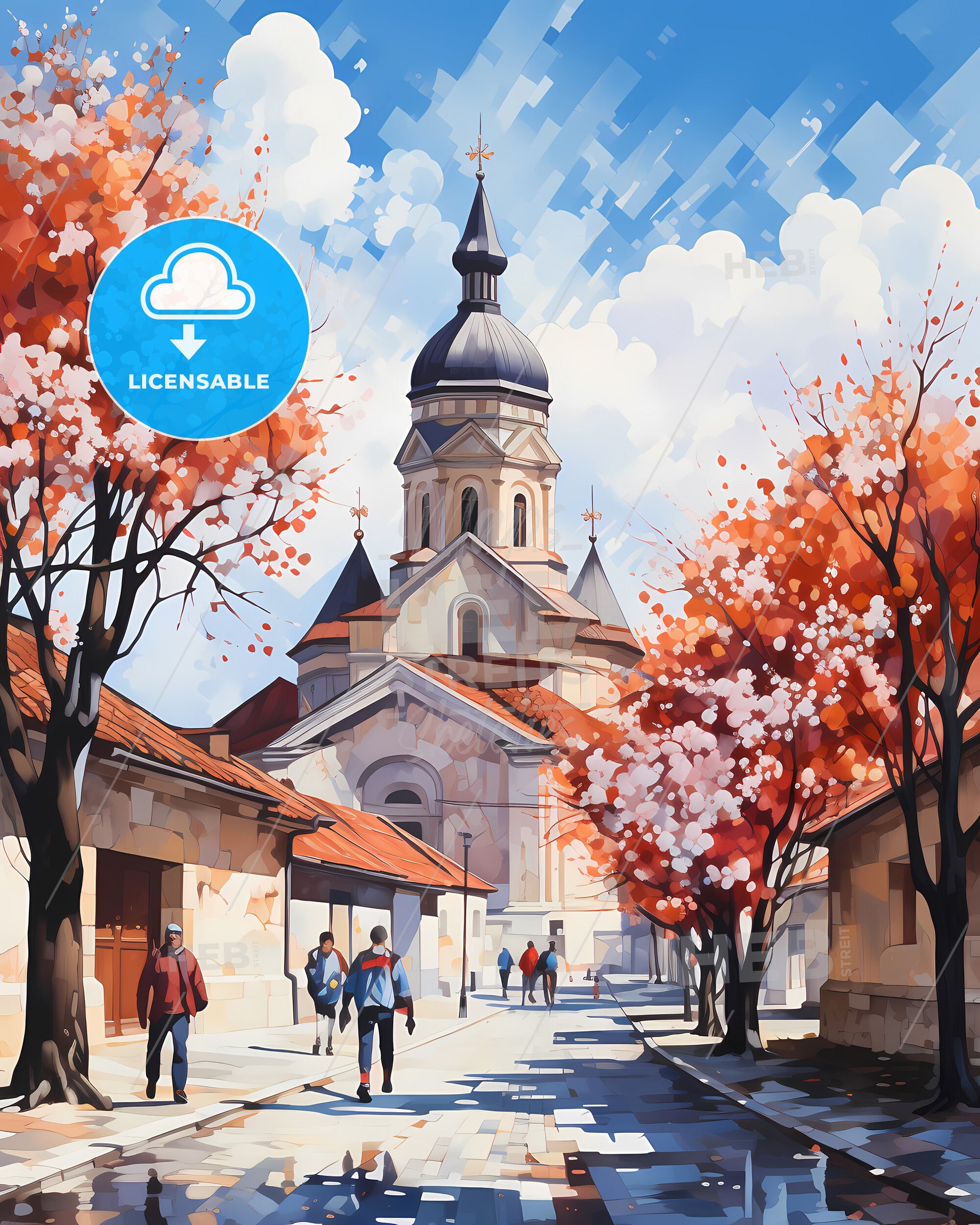 Streetart in Constanța, Romania. Urban city scene, Watercolor Painting, oil Painting, Colorful Art Painting, oil painting like paper art, travel art sunny day, in the style of pink and crimson, Beautiful white Cloud, Blue Sky Painting, Graphic excellence. Large area of copy space on top. dark Orange and retro Red, dark turquoise and yellow, minimal shading, panoramic View