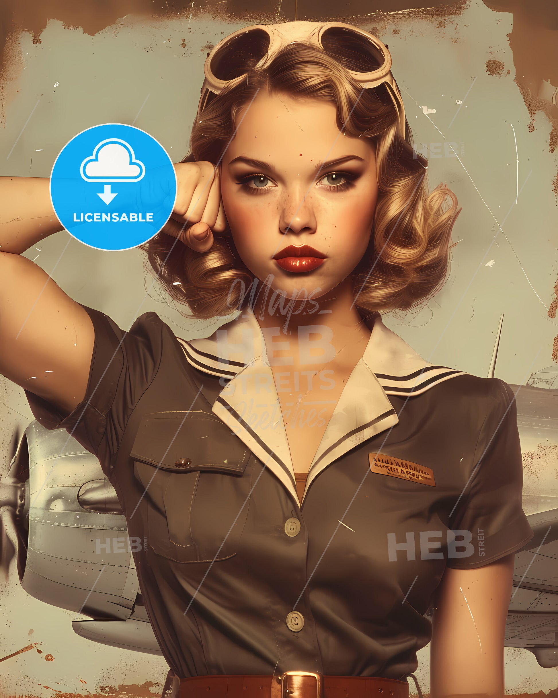 You Can Do It Woman, Vintage Artwork, Flexing Bicep, Wearing Flight Attendant Uniform, Making A Serious Face - A Woman In Uniform With Her Hand On Her Head