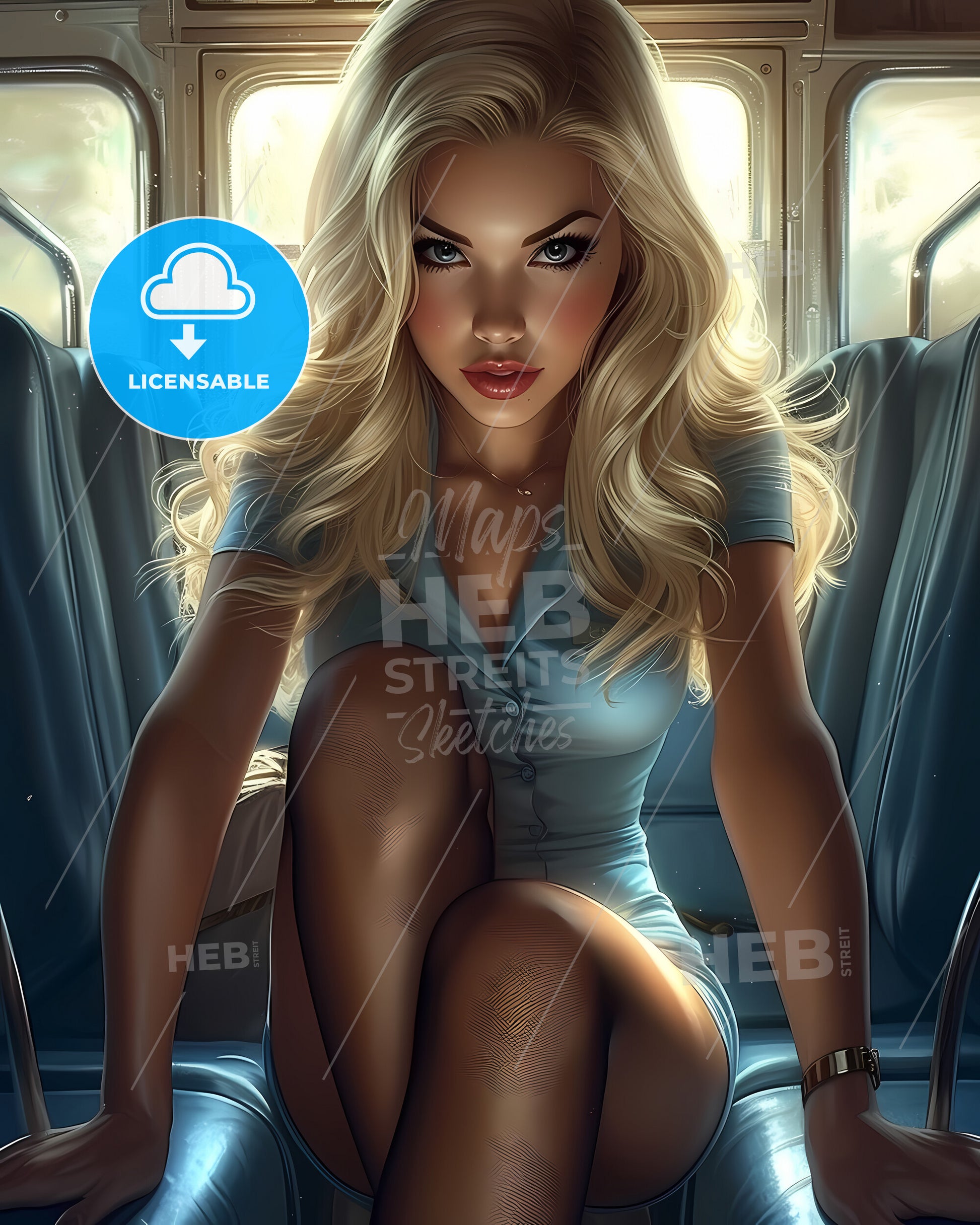 Pin Up Girl Wearing Stockings On A Boat, In The Style Of Realistic Blue Skies - A Woman Sitting In A Bus