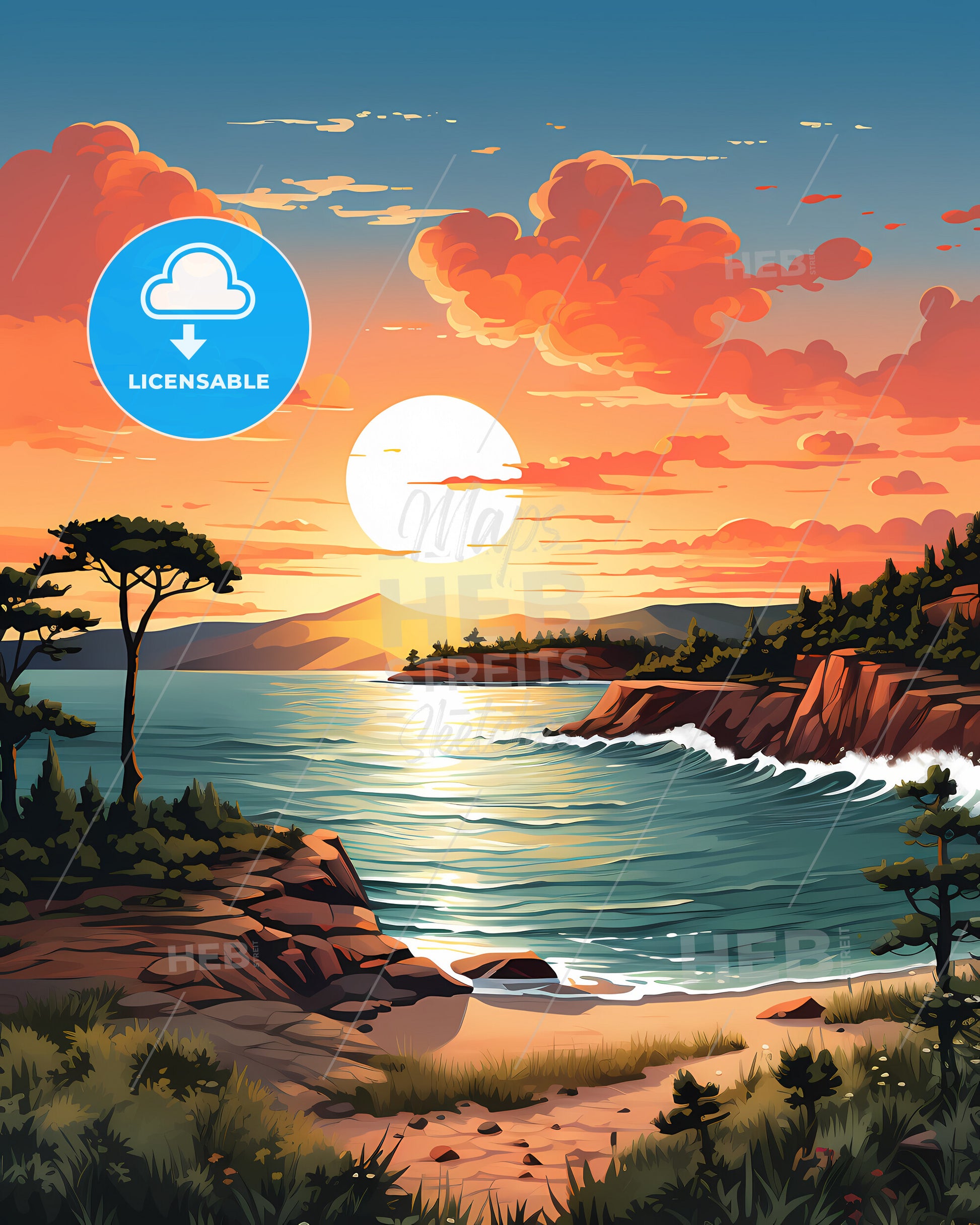 Sardinia, Italy. landscape, Watercolor Painting, oil Painting, Colorful Art Painting, oil painting like paper art, travel art sunny day, in the style of pink and crimson, Beautiful white Cloud, Blue Sky Painting, dark Orange and retro Red, dark turquoise and yellow, minimal shading, panoramic View