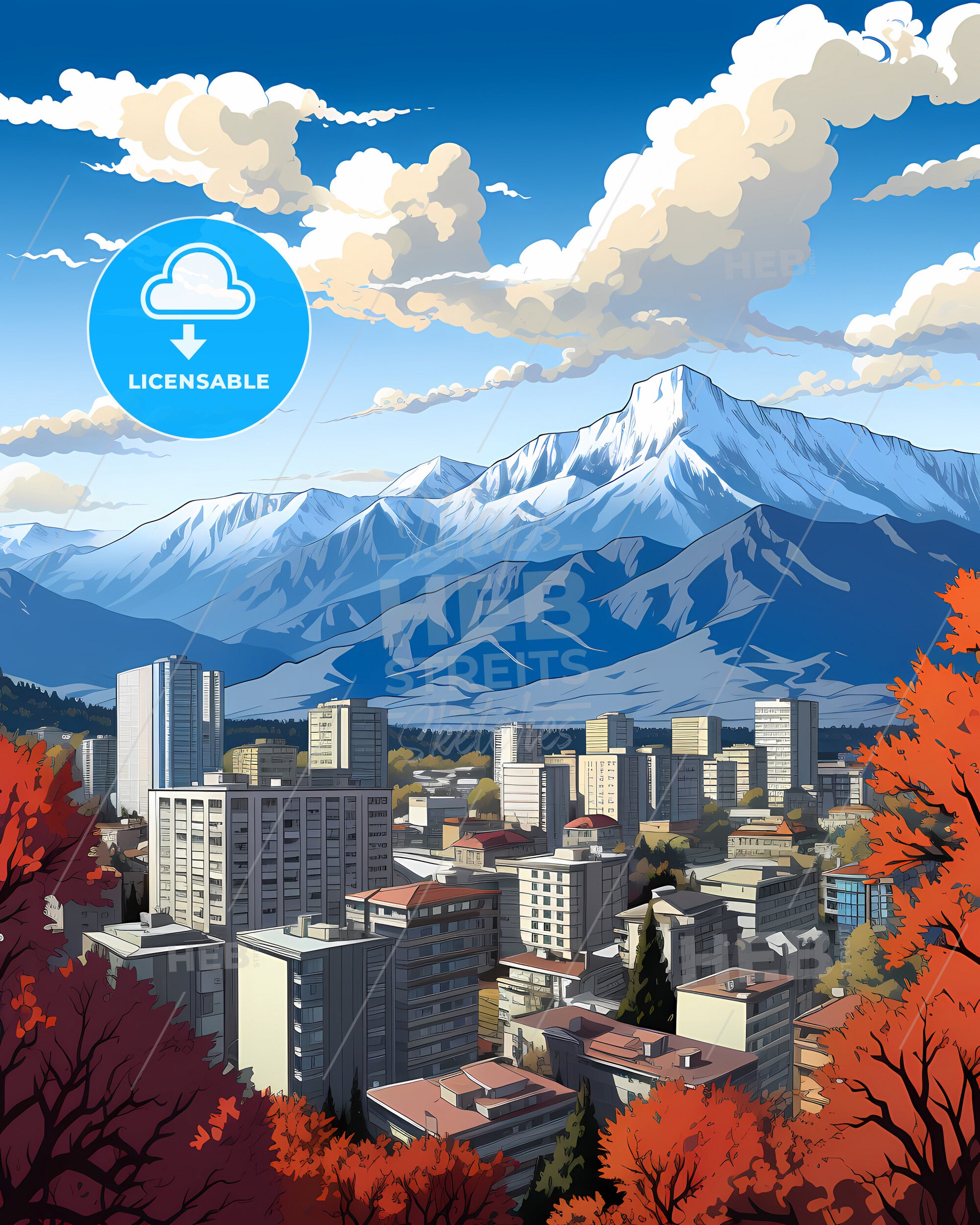Streetart in Skopje, North Macedonia. Urban city scene, Watercolor Painting, oil Painting, Colorful Art Painting, oil painting like paper art, travel art sunny day, in the style of pink and crimson, Beautiful white Cloud, Blue Sky Painting, Graphic excellence. Large area of copy space on top. dark Orange and retro Red, dark turquoise and yellow, minimal shading, panoramic View