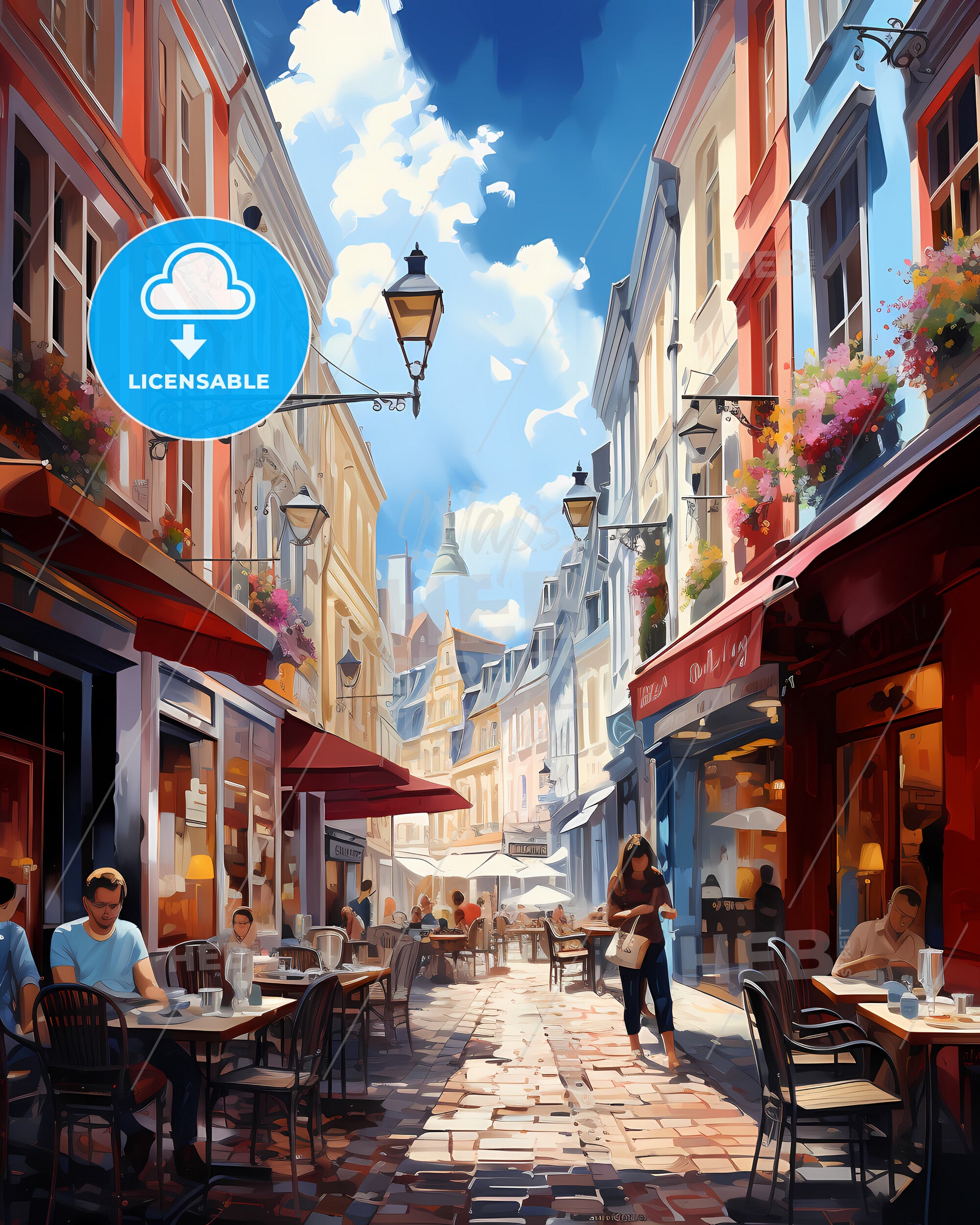 Streetart in Amiens, France. Urban city scene, Watercolor Painting, oil Painting, Colorful Art Painting, oil painting like paper art, travel art sunny day, in the style of pink and crimson, Beautiful white Cloud, Blue Sky Painting, Graphic excellence. Large area of copy space on top. dark Orange and retro Red, dark turquoise and yellow, minimal shading, panoramic View