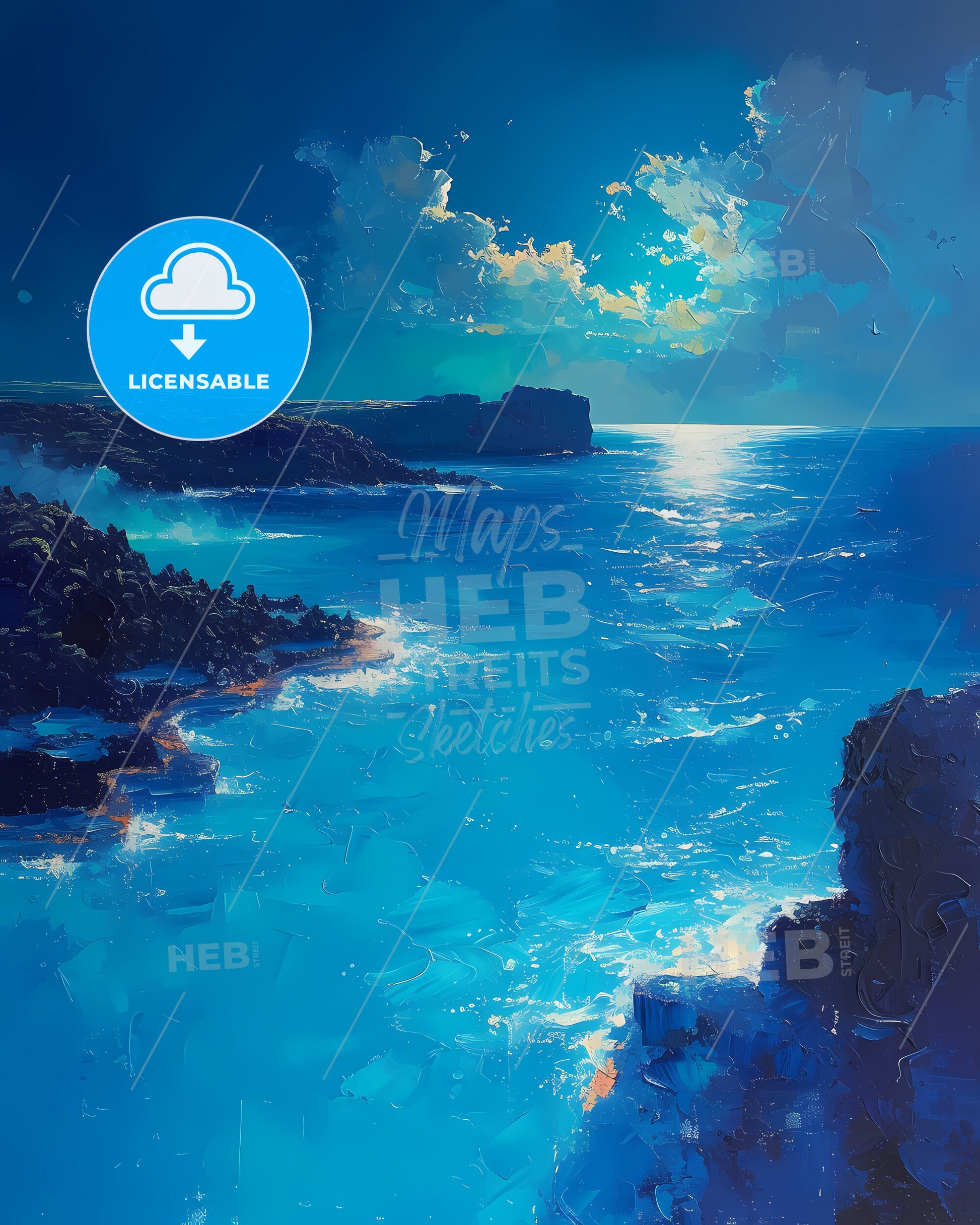 Blue Lagoon, Iceland. A geothermal spa surrounded by lava fields, offering a surreal experience. Art painting with deep blue sky an a focus on the turquoise water. Only some bright higher clouds in the distance. Style of impressionistic colorful painting made with acrylic colors, nice strokes and outlines. Large area of copy space on top. Some litte bright sparkles.