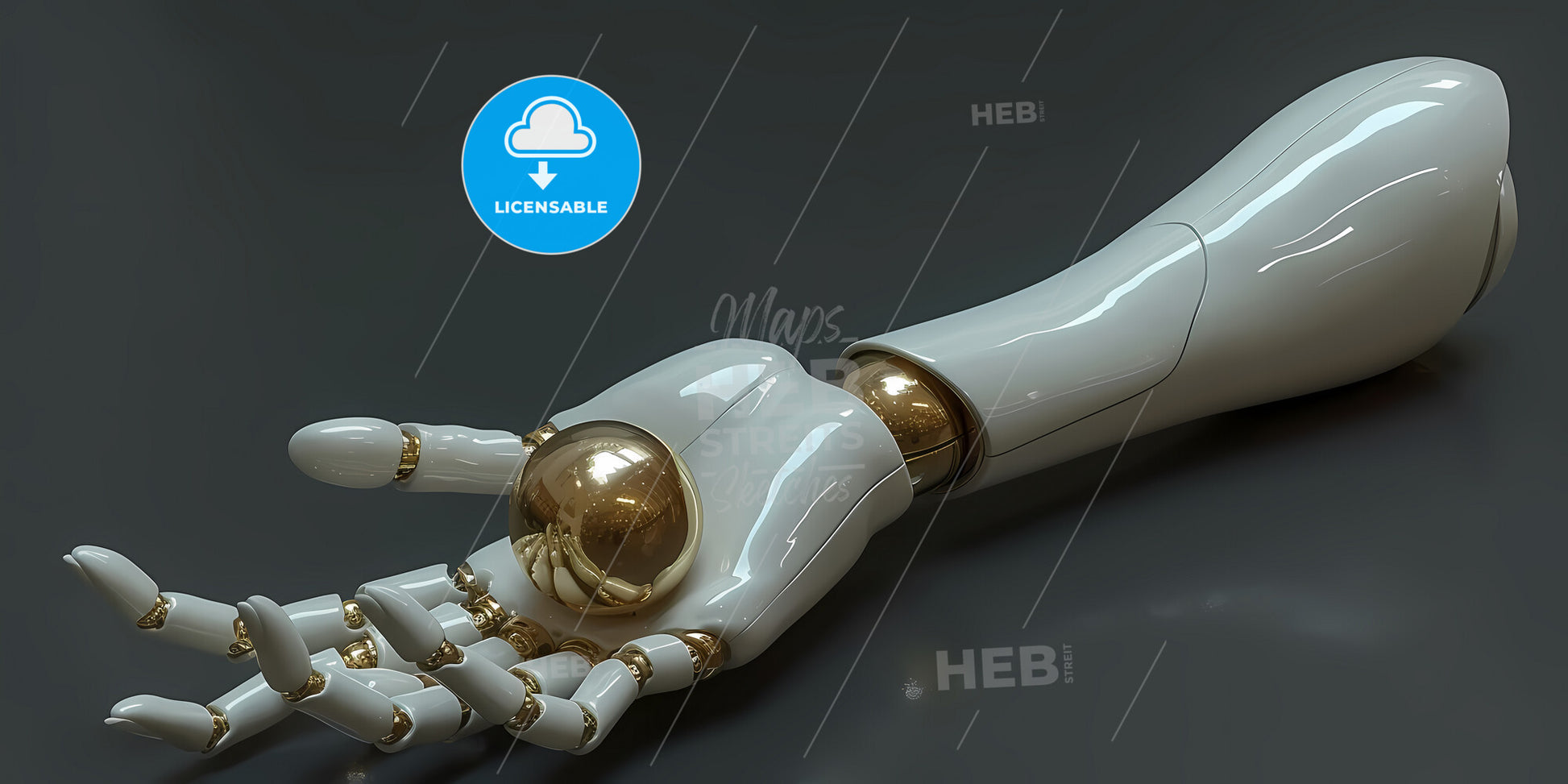 Mannequin Hand Holding Golden Ball, Open Palm Gesture Isolated On Black Background - A White And Gold Robotic Hand Holding A Gold Ball