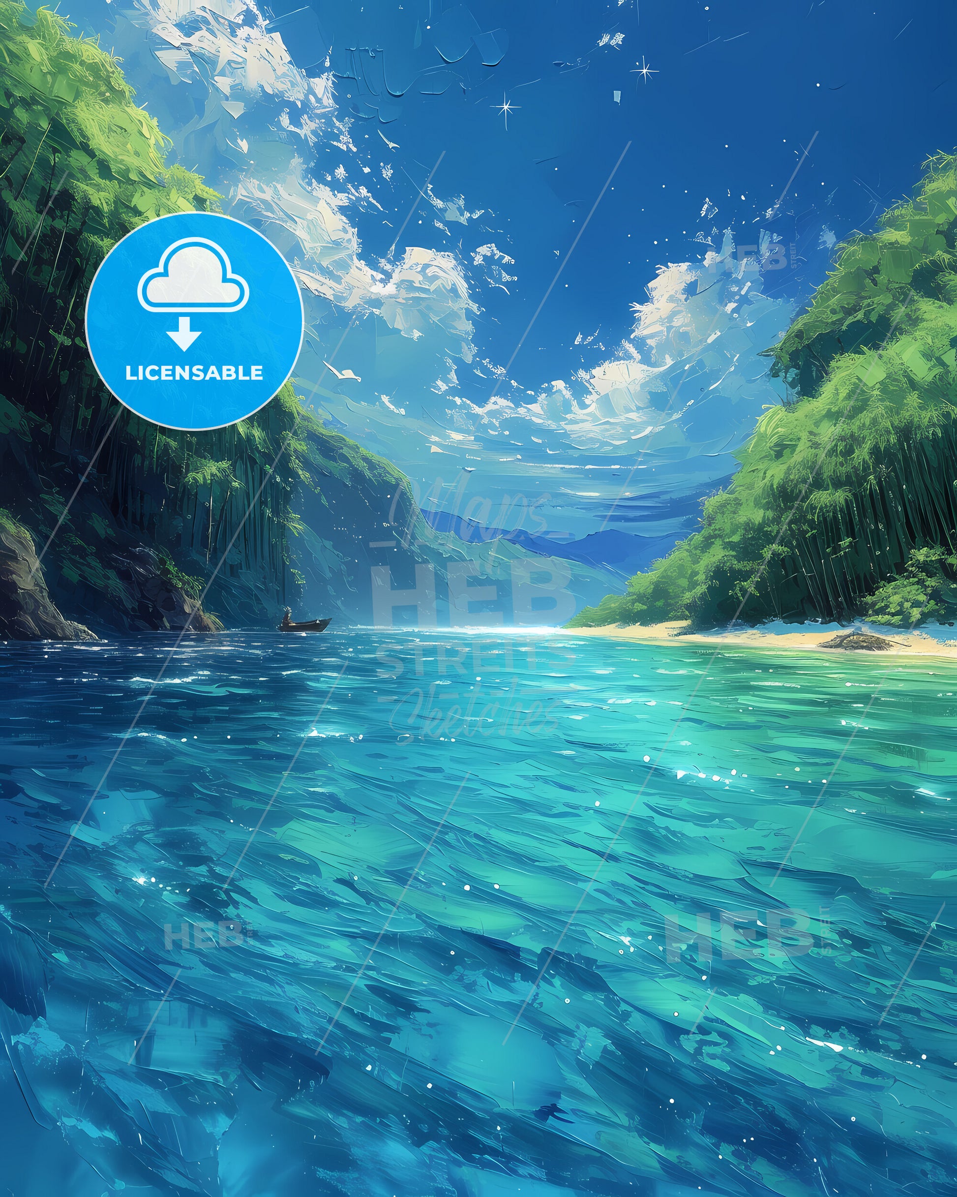 Katsura River, Japan. Known for its scenic boat rides with views of Arashiyama's bamboo groves. Art painting with deep blue sky an a focus on the turquoise clear water. Only some bright higher clouds in the distance. Style of impressionistic colorful painting made with acrylic colors, nice strokes and outlines. Large area of copy space on top. Some litte bright sparkles.