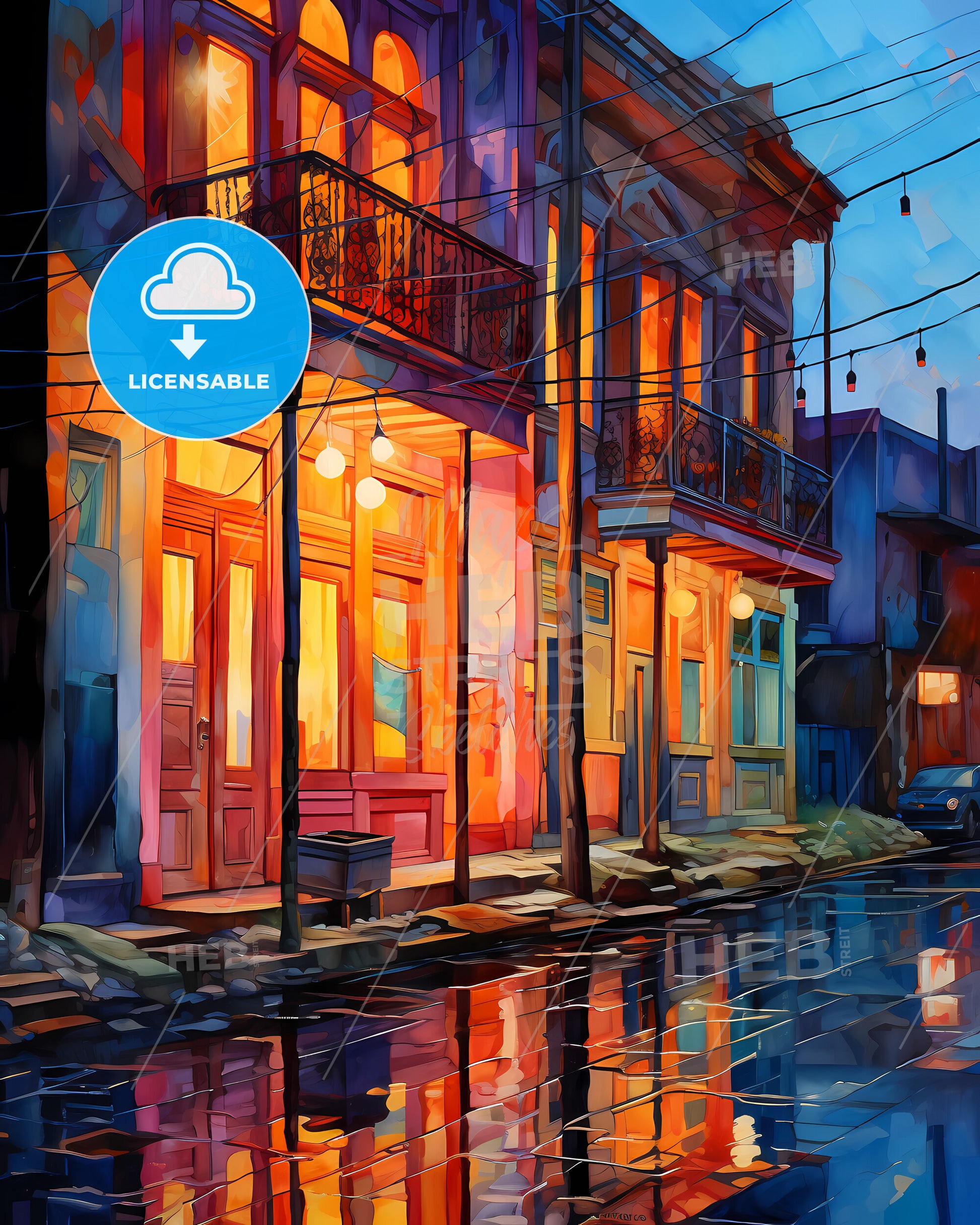 Thessaloniki, Greece - A Watercolor Of A Street With Buildings And A Reflection Of A Car
