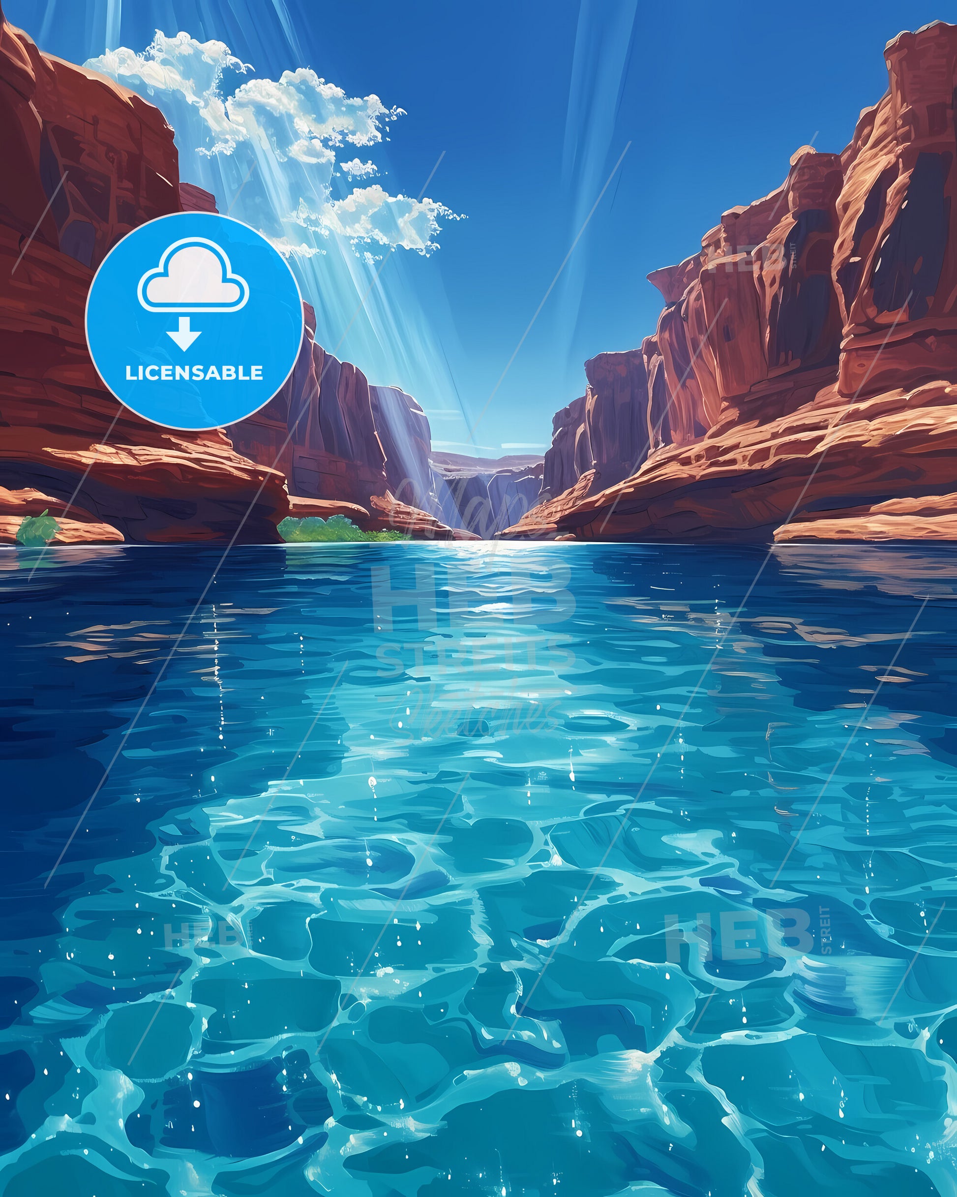 Antelope Canyon, USA. A slot canyon with mesmerizing light beams creating dreamlike scenes. Art painting with deep blue sky an a focus on the turquoise clear water. Only some bright higher clouds in the distance. Style of impressionistic colorful painting made with acrylic colors, nice strokes and outlines. Large area of copy space on top. Some litte bright sparkles.