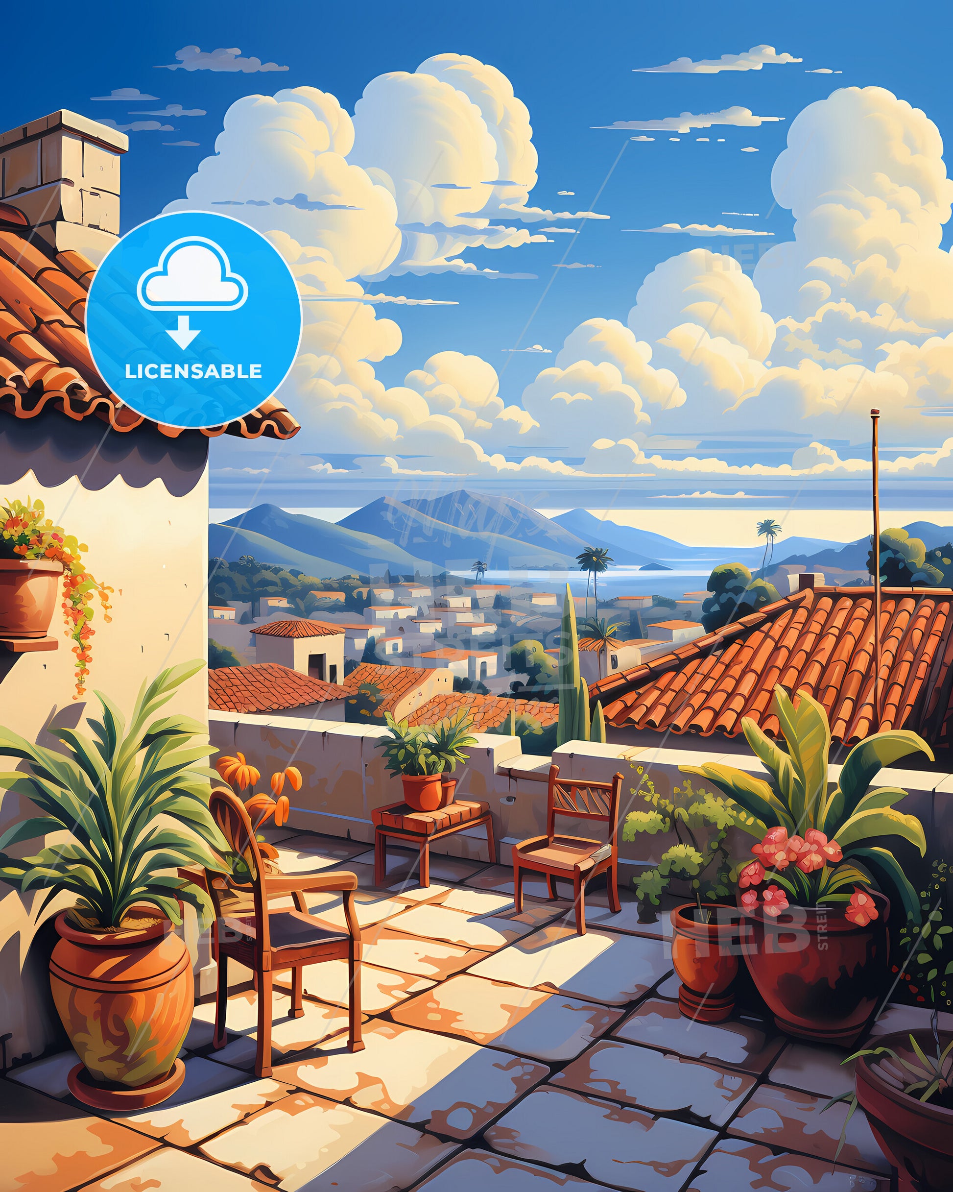 On the roof of Komodo Islands, Indonesia. Art painting with blue sky and bright fleecy clouds in the distance. Colorful Art Painting, oil painting like paper art with nice gradients. sunny day in the golden hour with a lot of roofs. nice shadows, strokes and outlines. Graphic excellence. Large area of copy space on top. litte bright sparkles. panoramic View, high resolution.