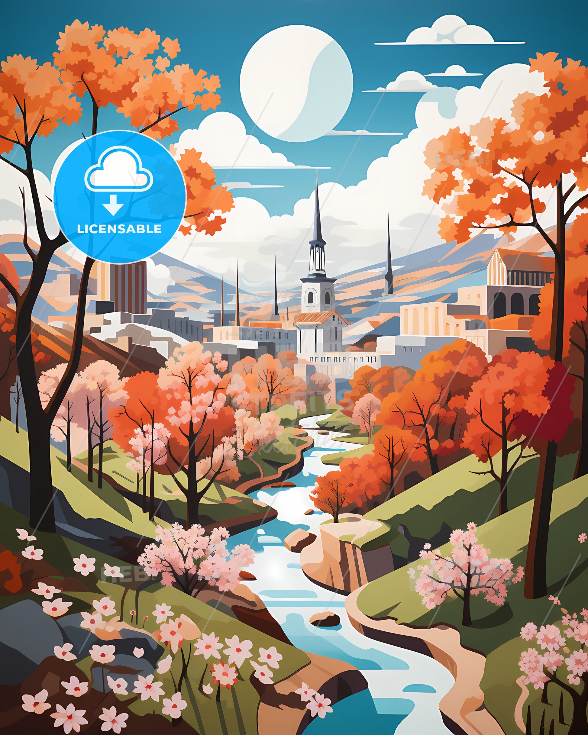 Streetart in Zaragoza, Spain. Urban city scene, Watercolor Painting, oil Painting, Colorful Art Painting, oil painting like paper art, travel art sunny day, in the style of pink and crimson, Beautiful white Cloud, Blue Sky Painting, Graphic excellence. Large area of copy space on top. dark Orange and retro Red, dark turquoise and yellow, minimal shading, panoramic View