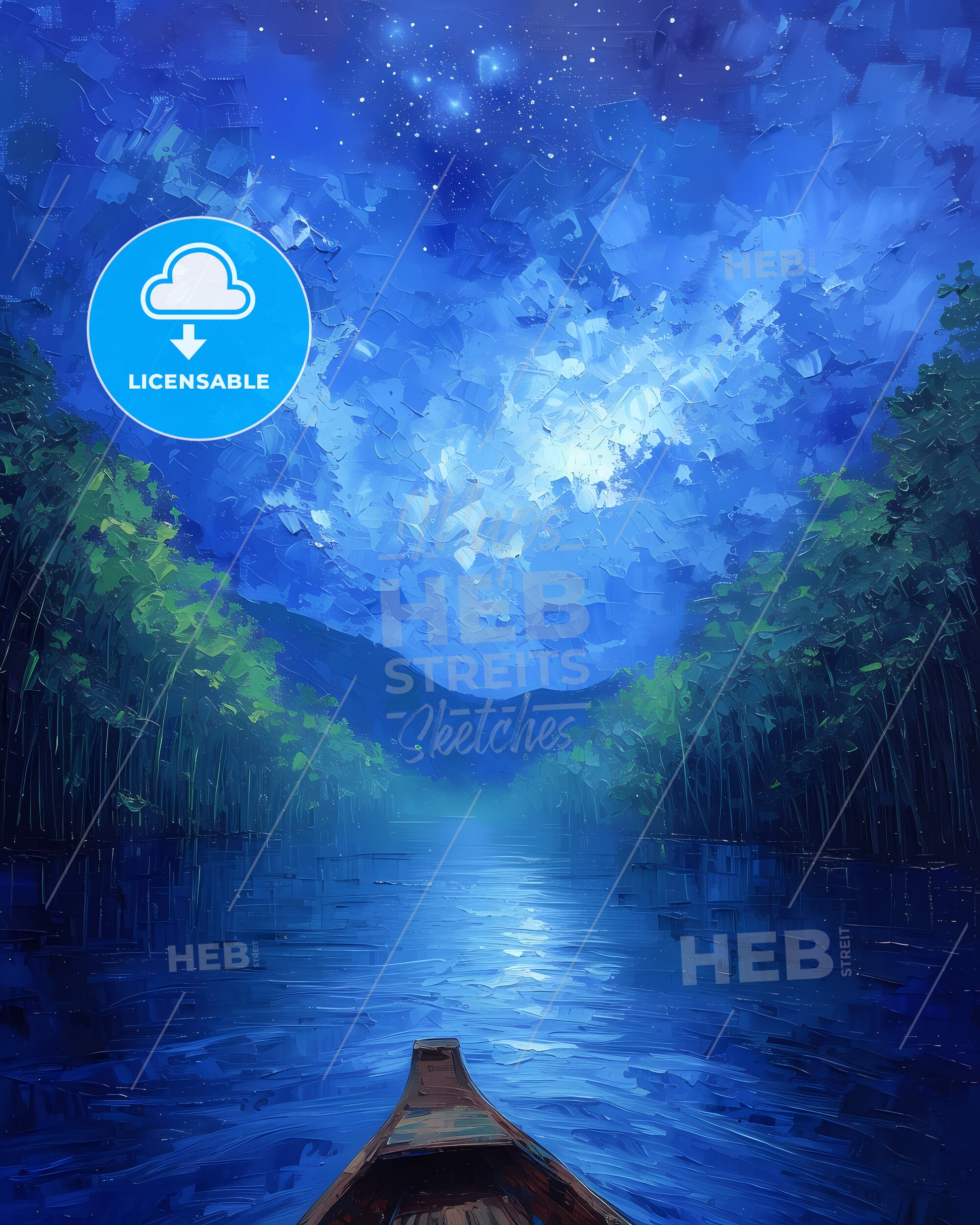 Katsura River, Japan. Known for its scenic boat rides with views of Arashiyama's bamboo groves. Art painting with deep blue sky. Only some bright higher clouds in the distance. Style of impressionistic colorful painting made with acrylic colors, nice strokes and outlines. Big area of copy space on top. Some litte bright sparkles.