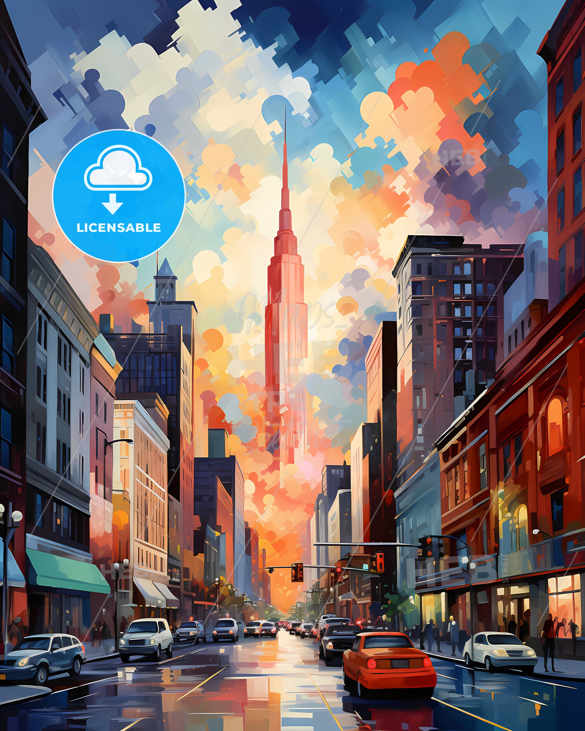 Streetart in Chicago. Urban city scene, Watercolor Painting, oil Painting, Colorful Art Painting, oil painting like paper art, travel art sunny day, in the style of pink and crimson, Beautiful white Cloud, Blue Sky Painting, Graphic excellence. Large area of copy space on top. dark Orange and retro Red, dark turquoise and yellow, minimal shading, panoramic View