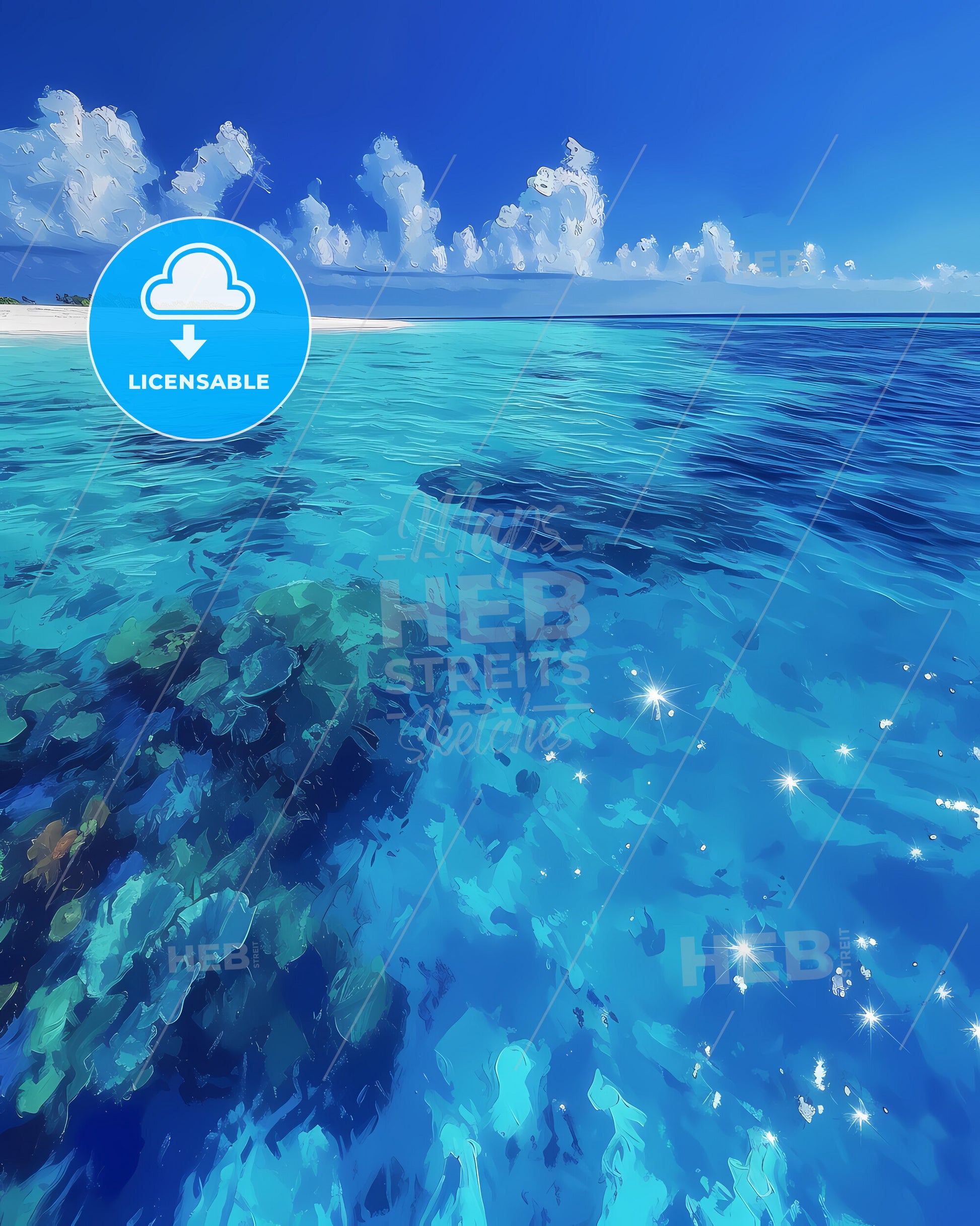 Derawan Islands, Indonesia. Pristine coral reefs, white sandy beaches, and turquoise waters. Art painting with deep blue sky an a focus on the turquoise clear water. Only some bright higher clouds in the distance. Style of impressionistic colorful painting made with acrylic colors, nice strokes and outlines. Large area of copy space on top. Some litte bright sparkles.