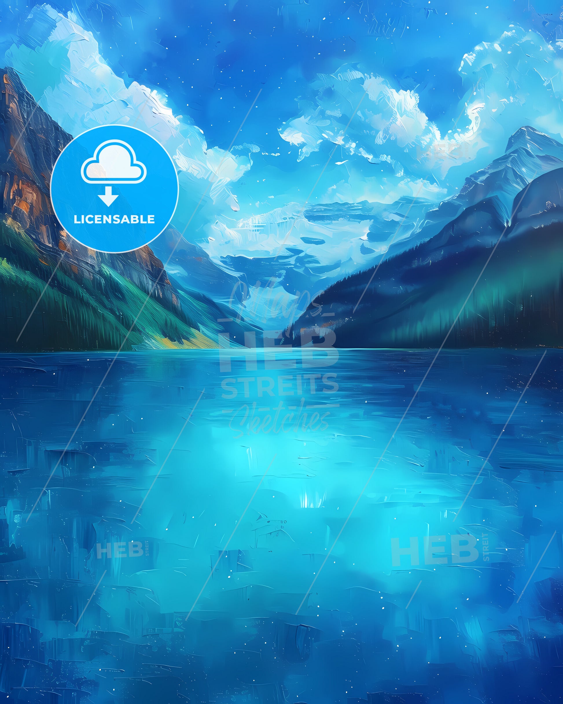 Lake Louise, Canada. A stunning glacial lake with turquoise waters nestled in the Canadian Rockies. Art painting with deep blue sky an a focus on the destination objective. Only some bright higher clouds in the distance. Style of impressionistic colorful painting made with acrylic colors, nice strokes and outlines. Large area of copy space on top. Some litte bright sparkles.