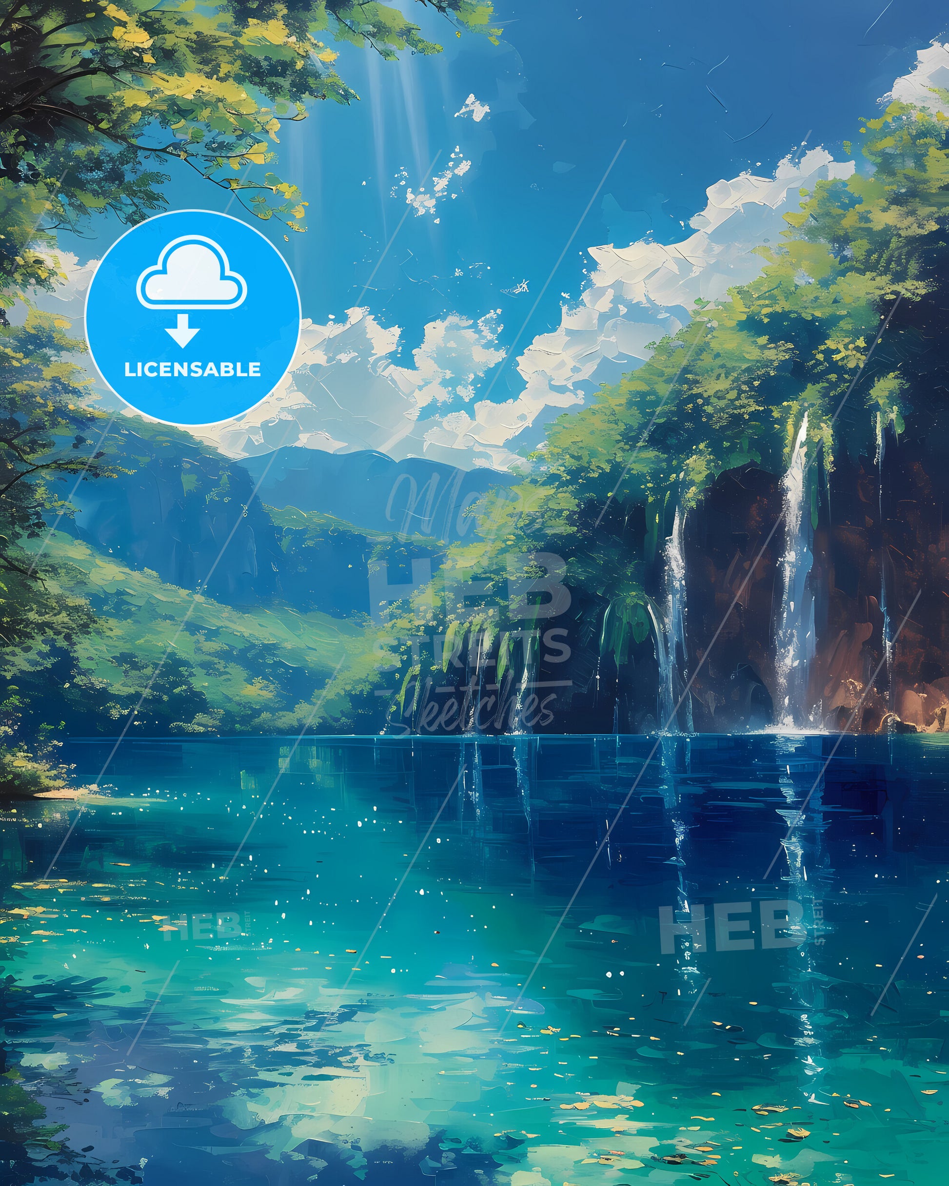 Lake Plitvica, Croatia. A series of interconnected lakes and waterfalls in a stunning national park. Art painting with deep blue sky an a focus on the turquoise clear water. Only some bright higher clouds in the distance. Style of impressionistic colorful painting made with acrylic colors, nice strokes and outlines. Large area of copy space on top. Some litte bright sparkles.