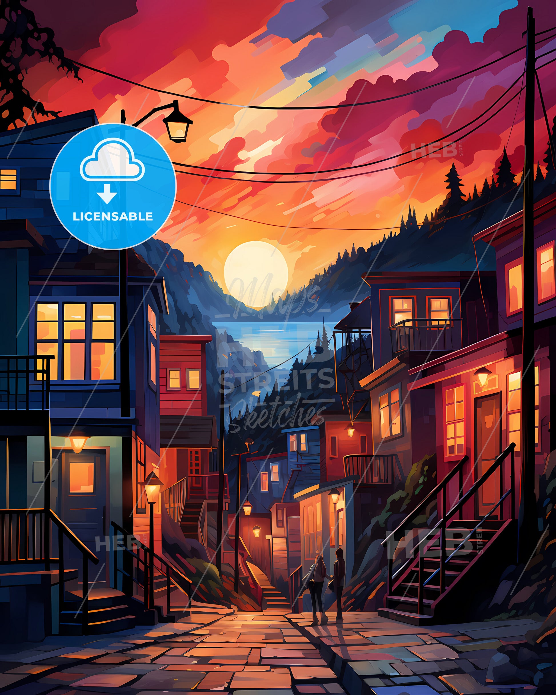 Streetart in Trondheim, Norway. Urban city scene, Watercolor Painting, oil Painting, Colorful Art Painting, oil painting like paper art, travel art sunny day, in the style of pink and crimson, Beautiful white Cloud, Blue Sky Painting, Graphic excellence. Large area of copy space on top. dark Orange and retro Red, dark turquoise and yellow, minimal shading, panoramic View
