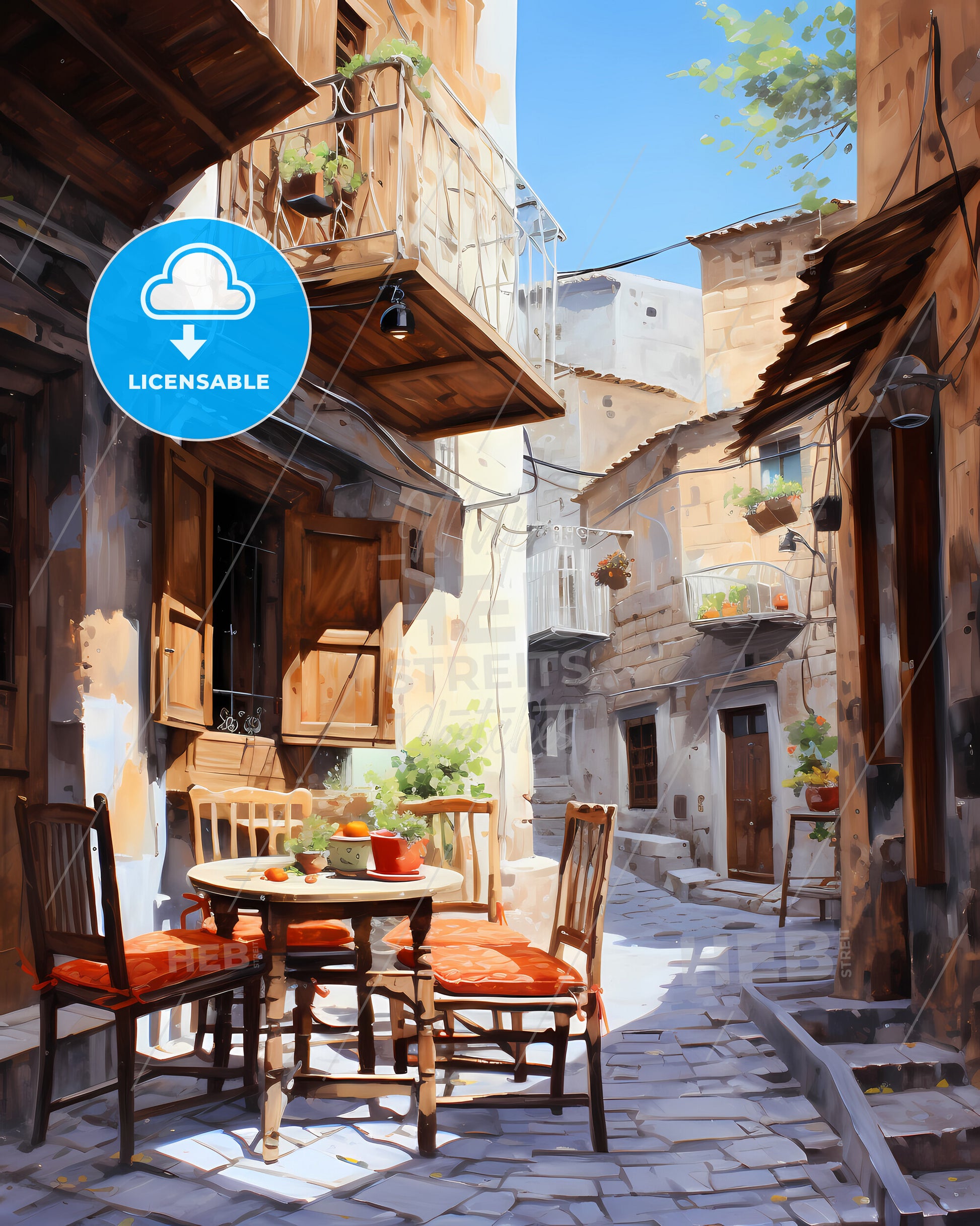 Streetart in Larnaca, Cyprus. Urban city scene, Watercolor Painting, oil Painting, Colorful Art Painting, oil painting like paper art, travel art sunny day, in the style of pink and crimson, Beautiful white Cloud, Blue Sky Painting, Graphic excellence. Large area of copy space on top. dark Orange and retro Red, dark turquoise and yellow, minimal shading, panoramic View