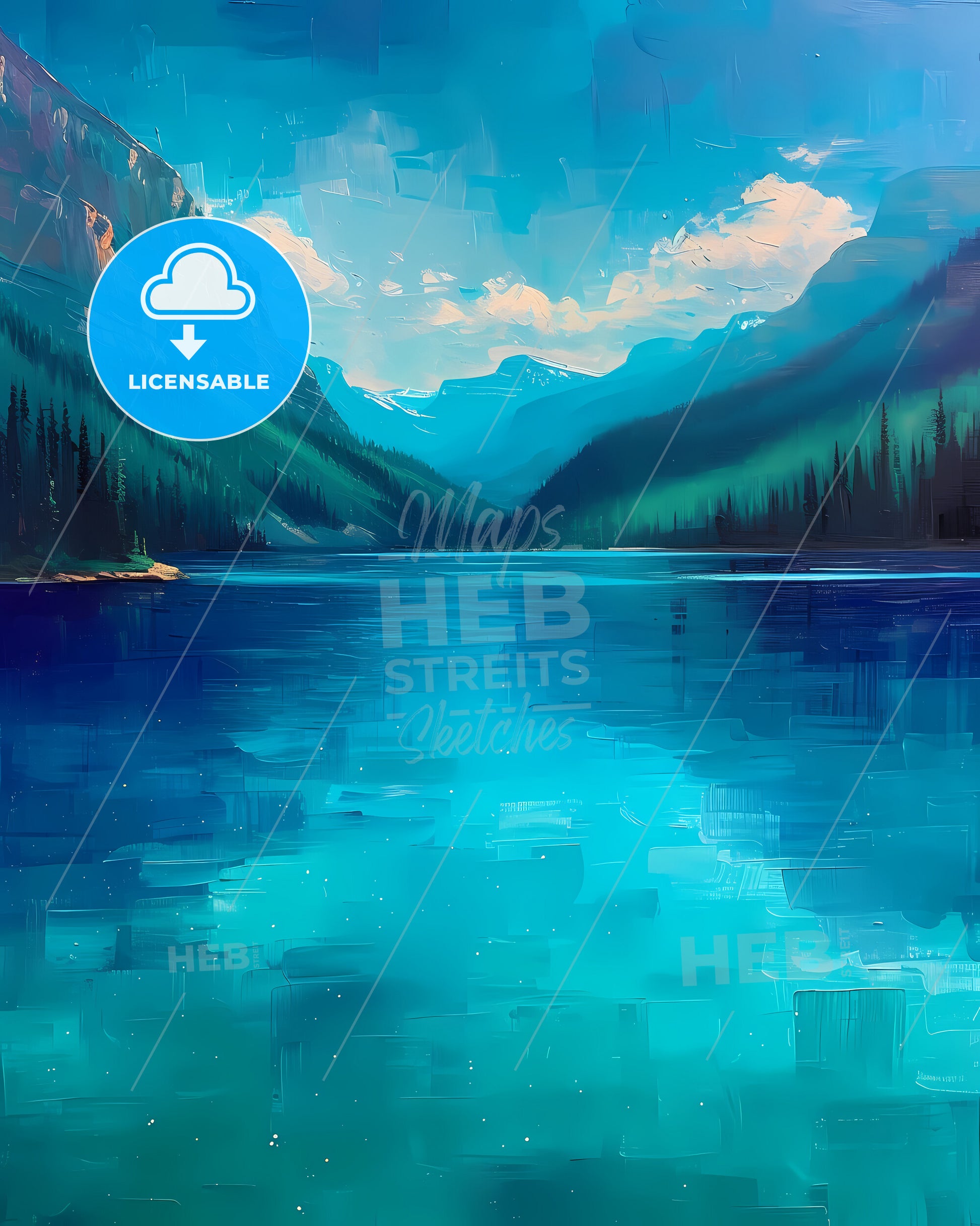 Emerald Lake, Canada. A vividly colored lake surrounded by the stunning landscapes of Yoho National Park. Art painting with deep blue sky an a focus on the turquoise clear water. Only some bright higher clouds in the distance. Style of impressionistic colorful painting made with acrylic colors, nice strokes and outlines. Large area of copy space on top. Some litte bright sparkles.