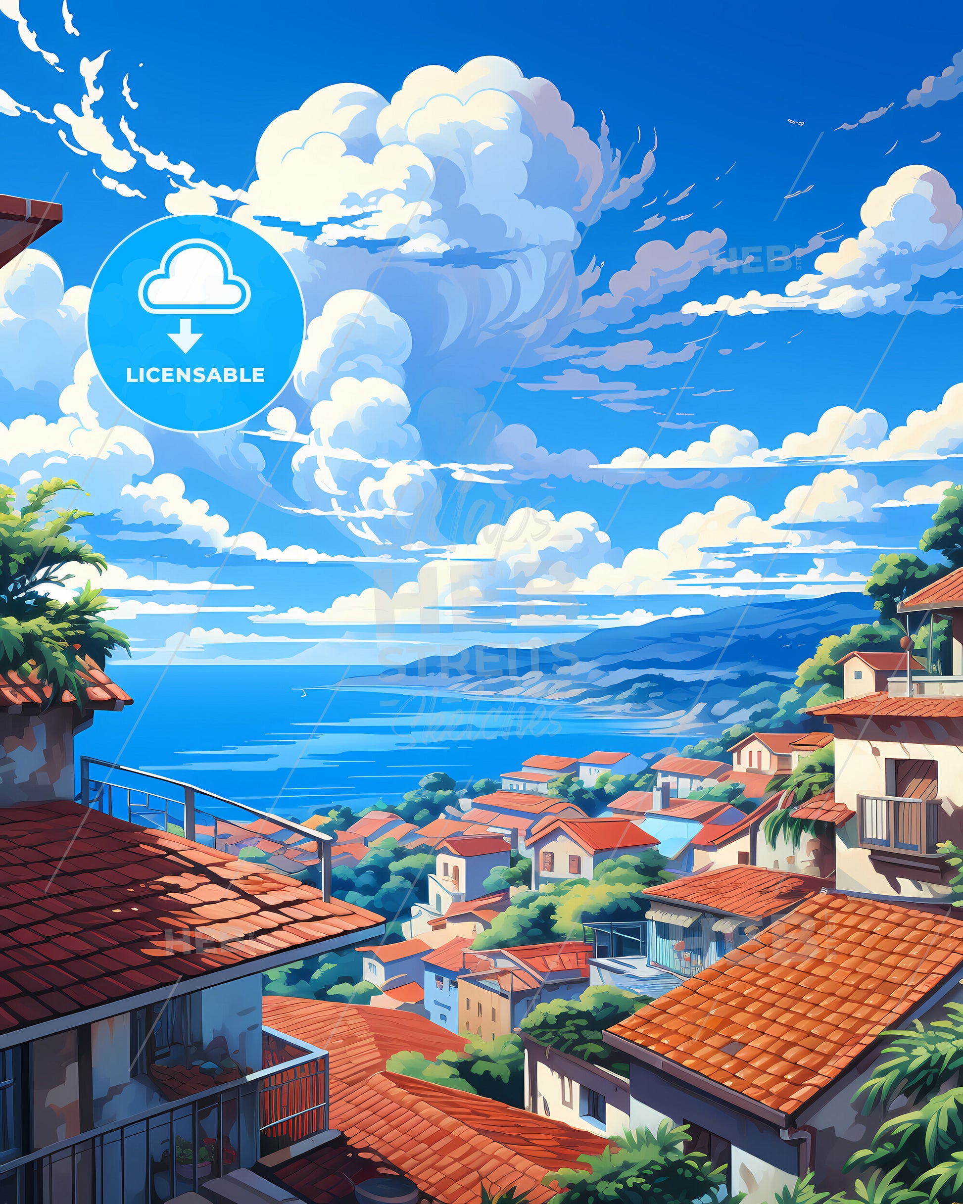 On the roof of Perhentian Islands, Malaysia. Art painting with blue sky and bright fleecy clouds in the distance. Colorful Art Painting, oil painting like paper art with nice gradients. sunny day in the golden hour with a lot of roofs. nice shadows, strokes and outlines. Graphic excellence. Large area of copy space on top. litte bright sparkles. panoramic View, high resolution.