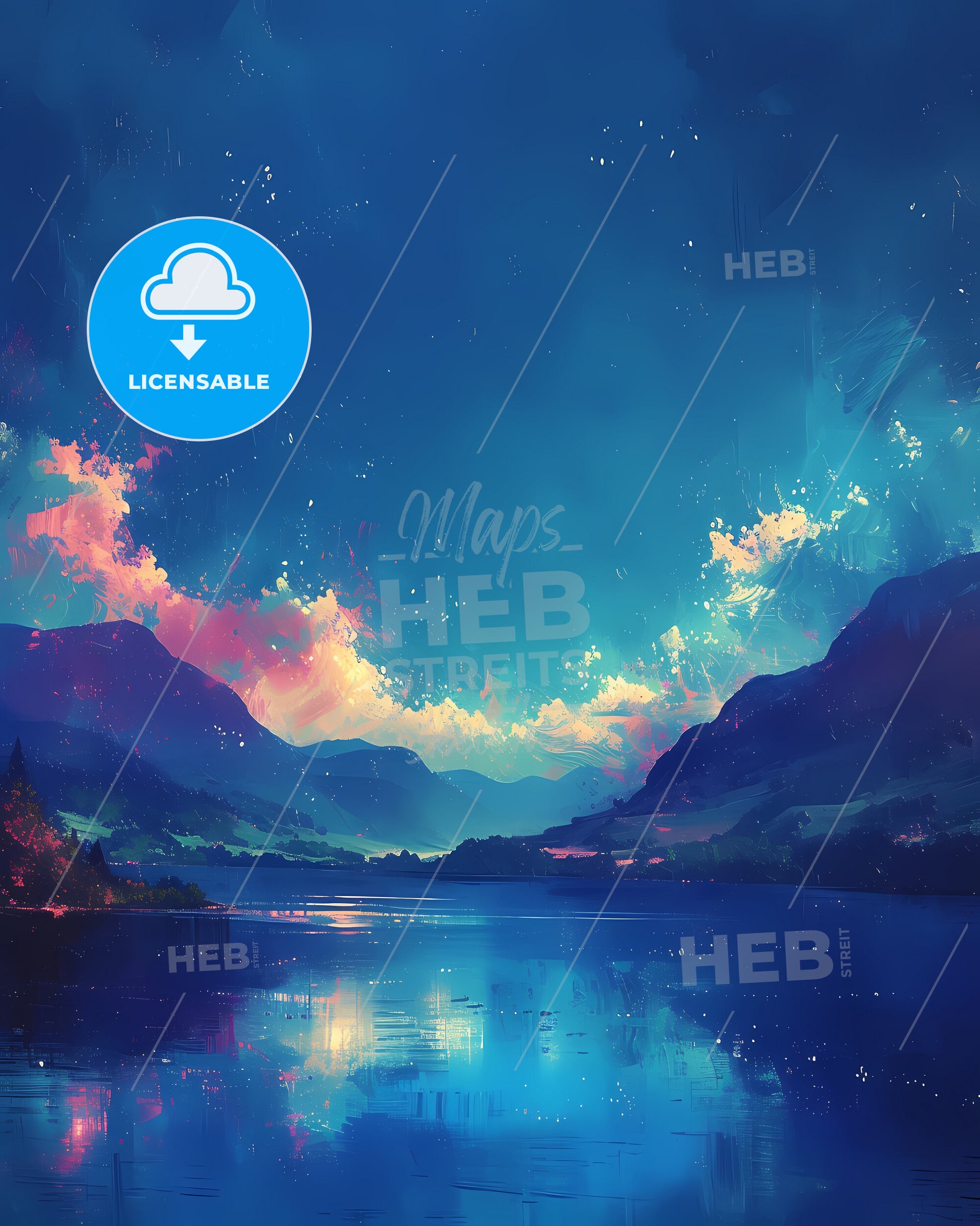 Lake District, England. A picturesque region with numerous lakes, including Windermere and Ullswater. Art painting with deep blue sky. Only some bright higher clouds in the distance. Style of impressionistic colorful painting made with acrylic colors, nice strokes and outlines. Big area of copy space on top. Some litte bright sparkles.