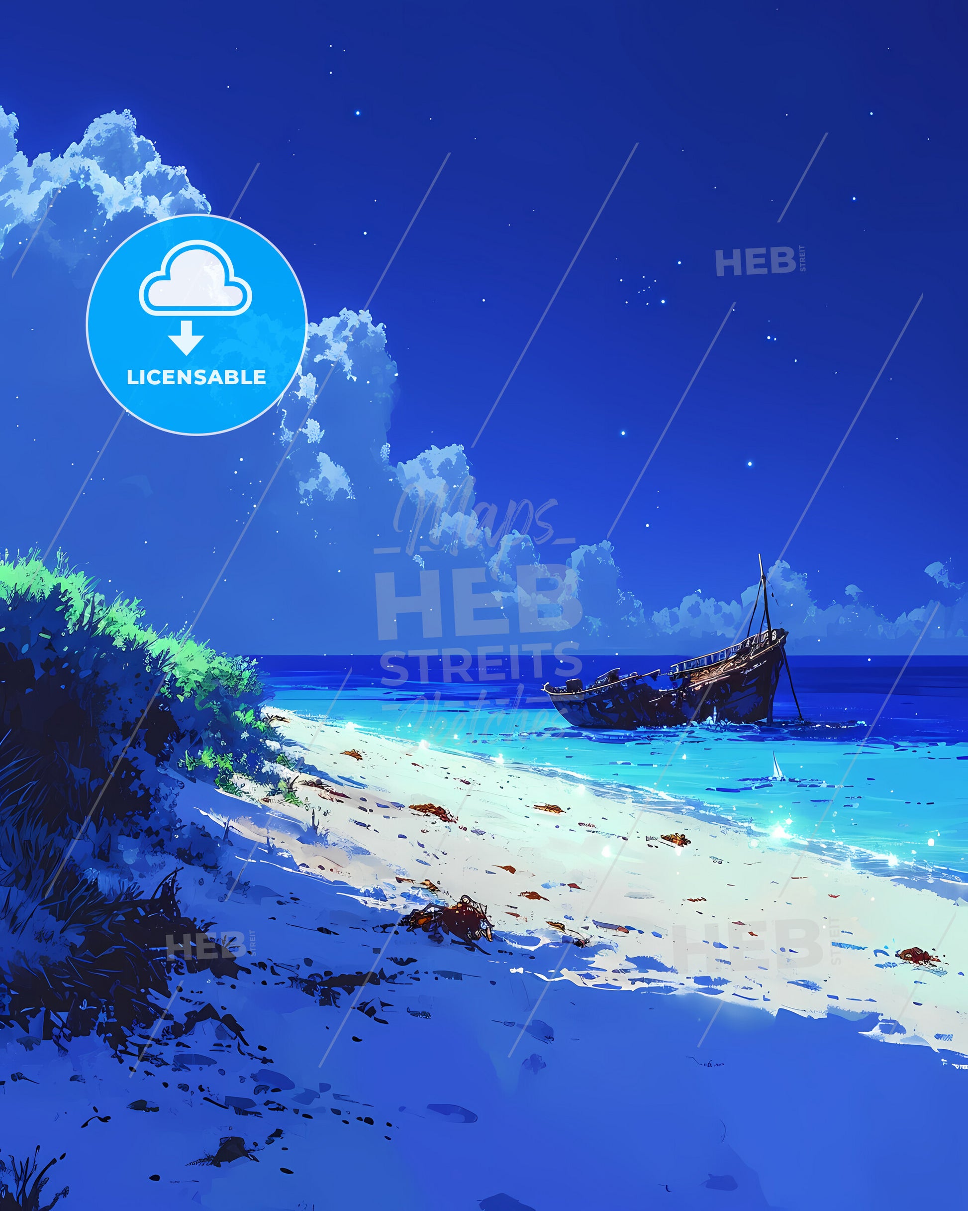 Navagio Beach (Shipwreck Beach). Navagio Beach is known for its pristine white sand and the wreck of a shipwrecked smuggler's boat. Art painting with deep blue sky. Only some bright higher clouds in the distance. Style of 2d flat game art illustration. 64k high resolution. Large area of copy space on top. litte bright sparkles.