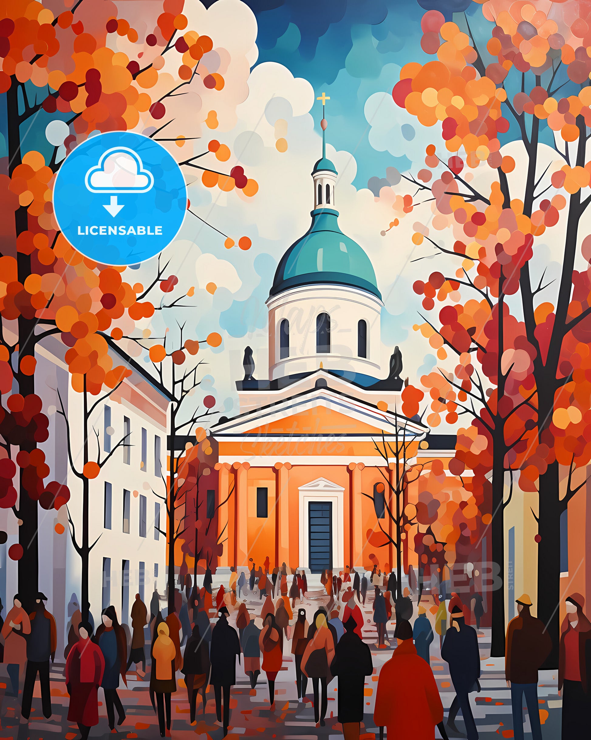 Helsinki, Finland - A Group Of People Walking In Front Of A Building