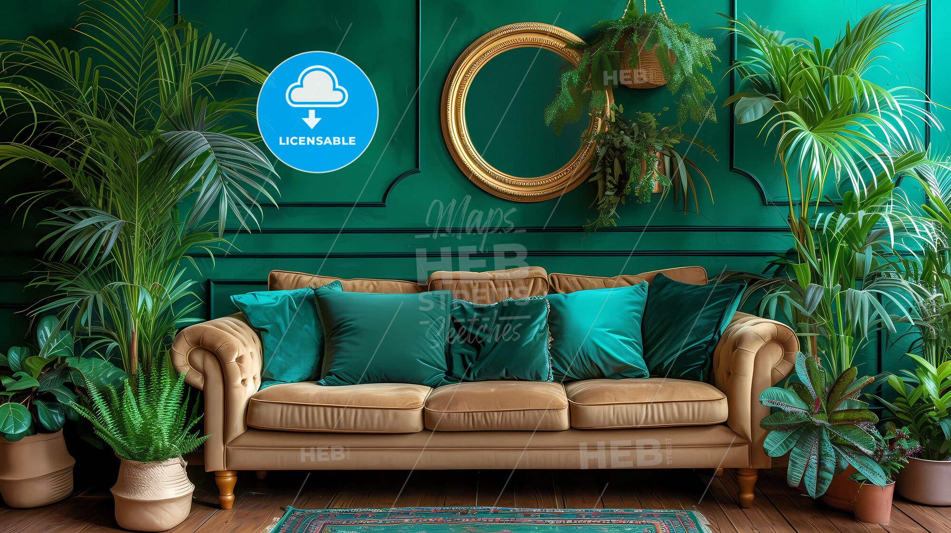 Contemporary living room with brown eco leather couch. cushions, gold-framed mirror picture frame on wall, and potted houseplant