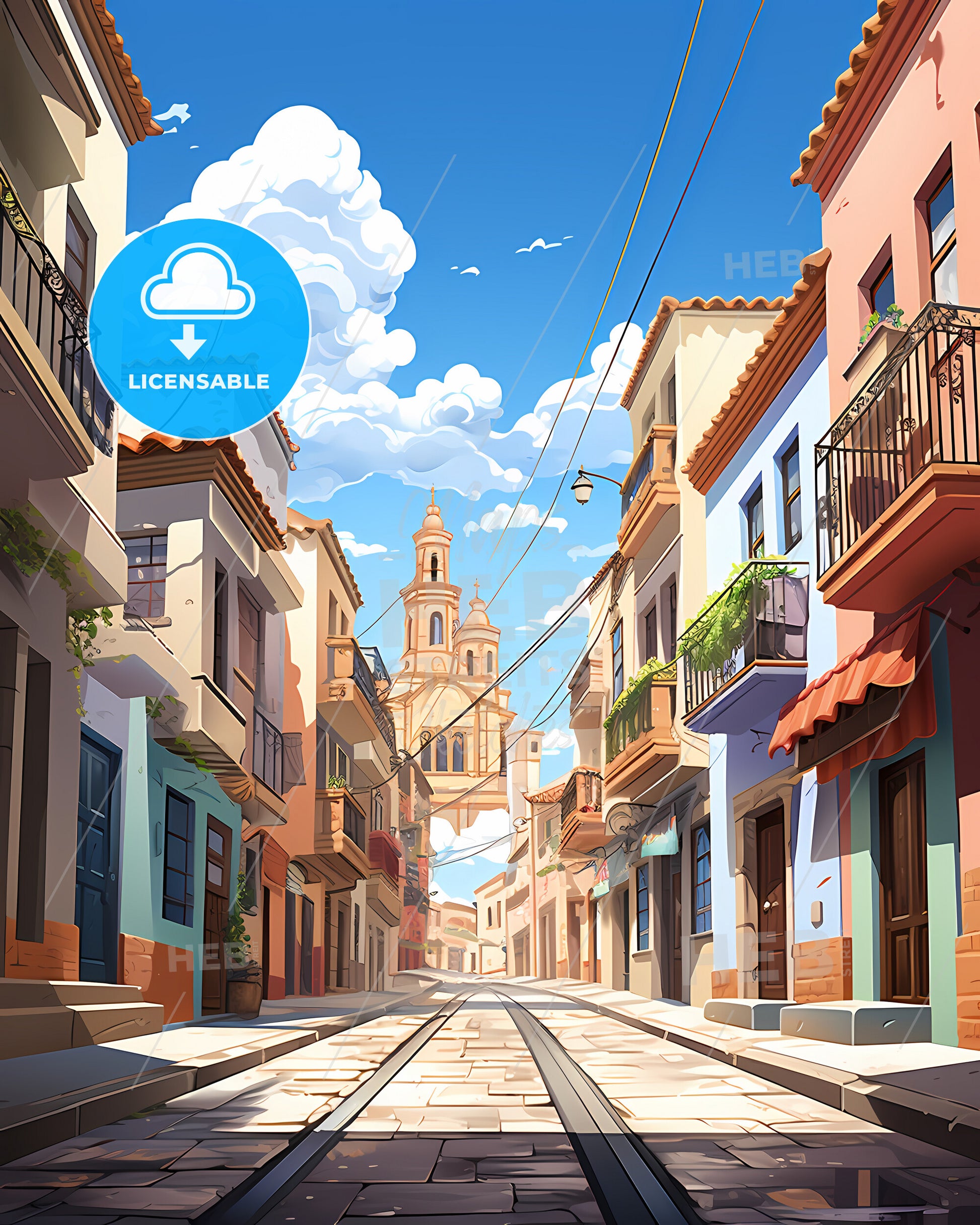 Streetart in Valladolid, Spain. Urban city scene, Watercolor Painting, oil Painting, Colorful Art Painting, oil painting like paper art, travel art sunny day, in the style of pink and crimson, Beautiful white Cloud, Blue Sky Painting, Graphic excellence. Large area of copy space on top. dark Orange and retro Red, dark turquoise and yellow, minimal shading, panoramic View