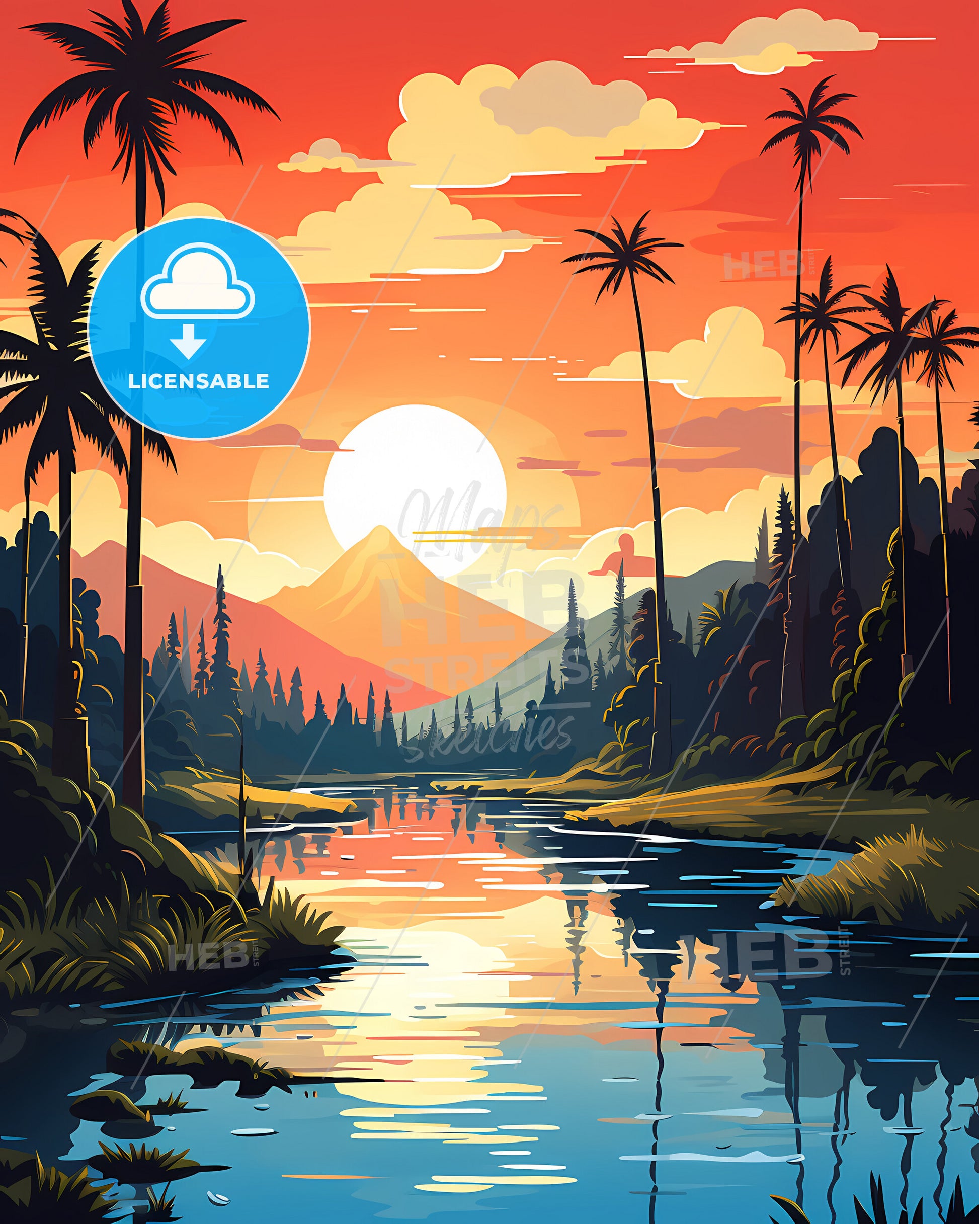Cook Islands, New Zealand. landscape, Watercolor Painting, oil Painting, Colorful Art Painting, oil painting like paper art, travel art sunny day, in the style of pink and crimson, Beautiful white Cloud, Blue Sky Painting, dark Orange and retro Red, dark turquoise and yellow, minimal shading, panoramic View