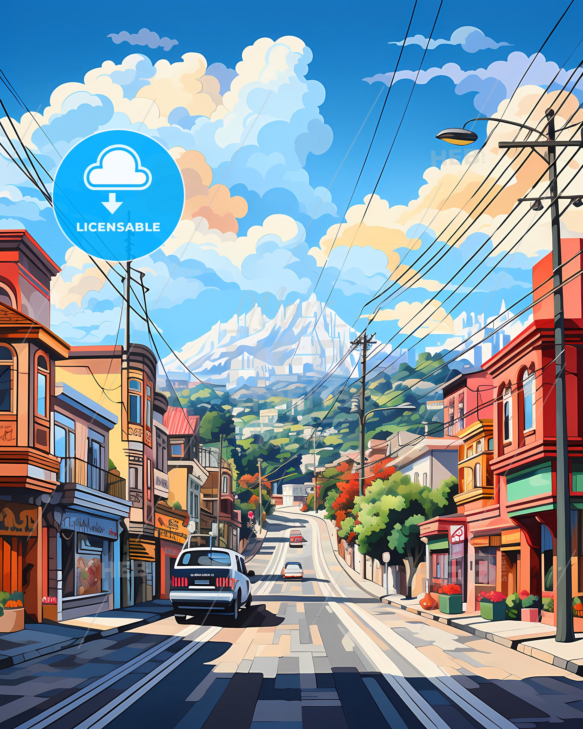 Streetart in Tirana, Albania,. Urban city scene, Watercolor Painting, oil Painting, Colorful Art Painting, oil painting like paper art, travel art sunny day, in the style of pink and crimson, Beautiful white Cloud, Blue Sky Painting, Graphic excellence. Large area of copy space on top. dark Orange and retro Red, dark turquoise and yellow, minimal shading, panoramic View