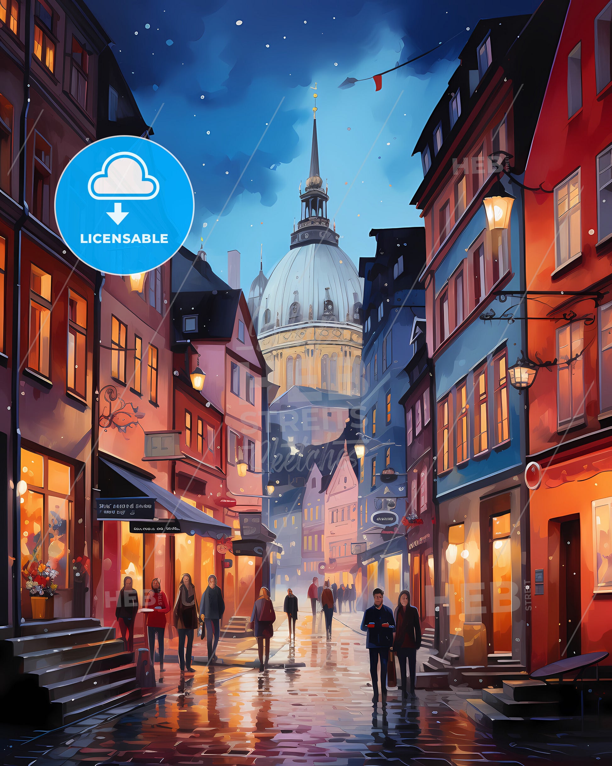 Streetart in Stuttgart, Germany. Urban city scene, Watercolor Painting, oil Painting, Colorful Art Painting, oil painting like paper art, travel art sunny day, in the style of pink and crimson, Beautiful white Cloud, Blue Sky Painting, Graphic excellence. Large area of copy space on top. dark Orange and retro Red, dark turquoise and yellow, minimal shading, panoramic View