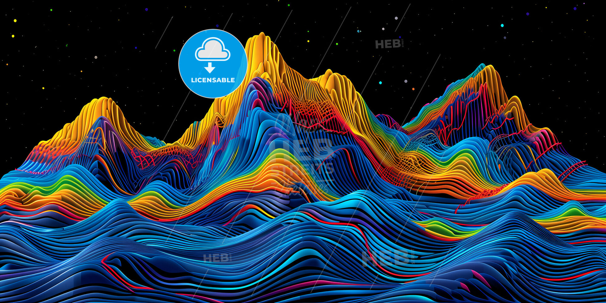 Stunning aesthetic wallpaper. Surreal landscape: rocky mountains and neon curvy colorful lines in motion. Flowing energy concept. Glowing trajectory path. Abstract futuristic background.