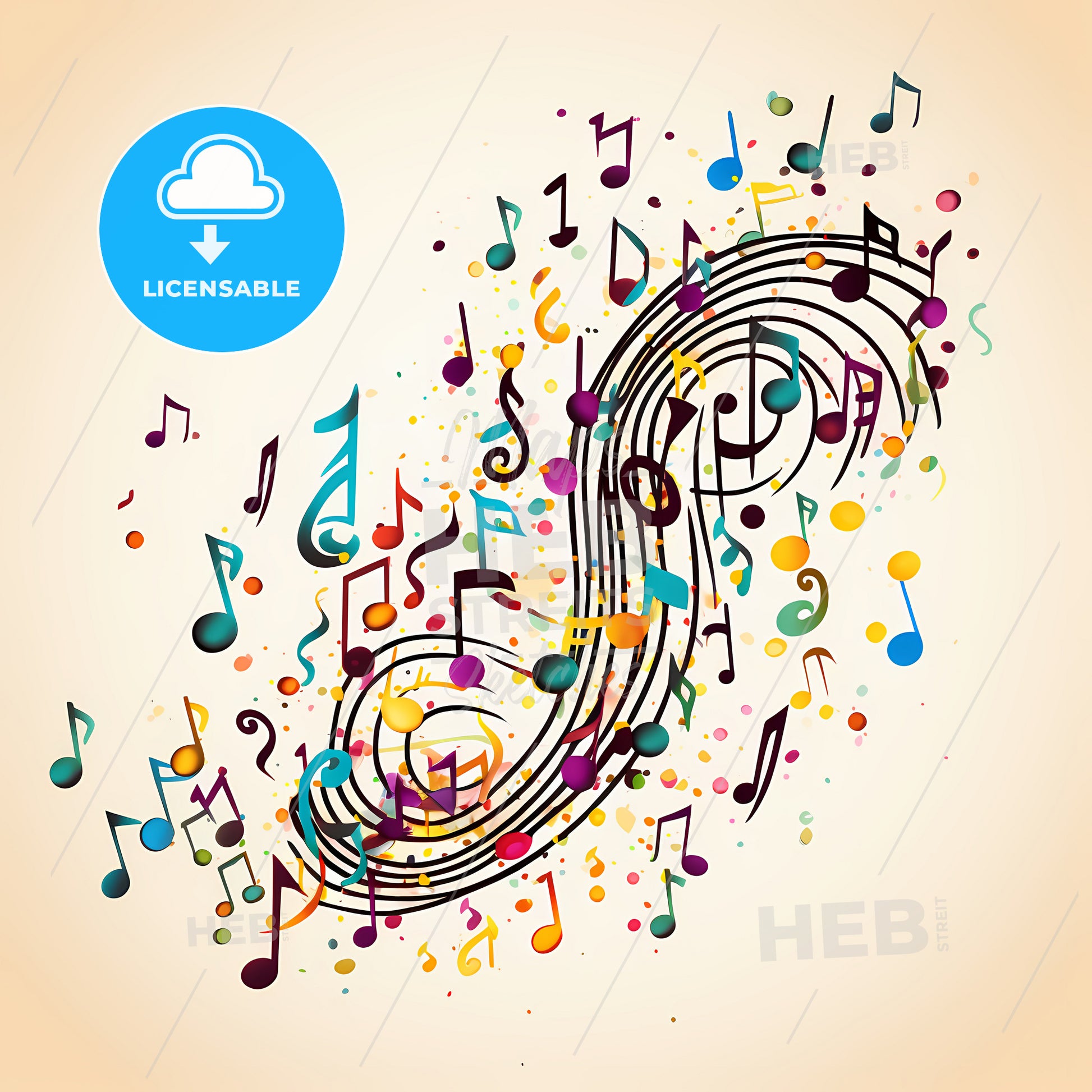 A vibrant illustration featuring a variety of musical notes and symbols in multiple colors. The notes range from whole notes to half notes, and the symbols include treble clefs, sharps, and flats. The notes and symbols are arranged in an intricate pattern on a white background.