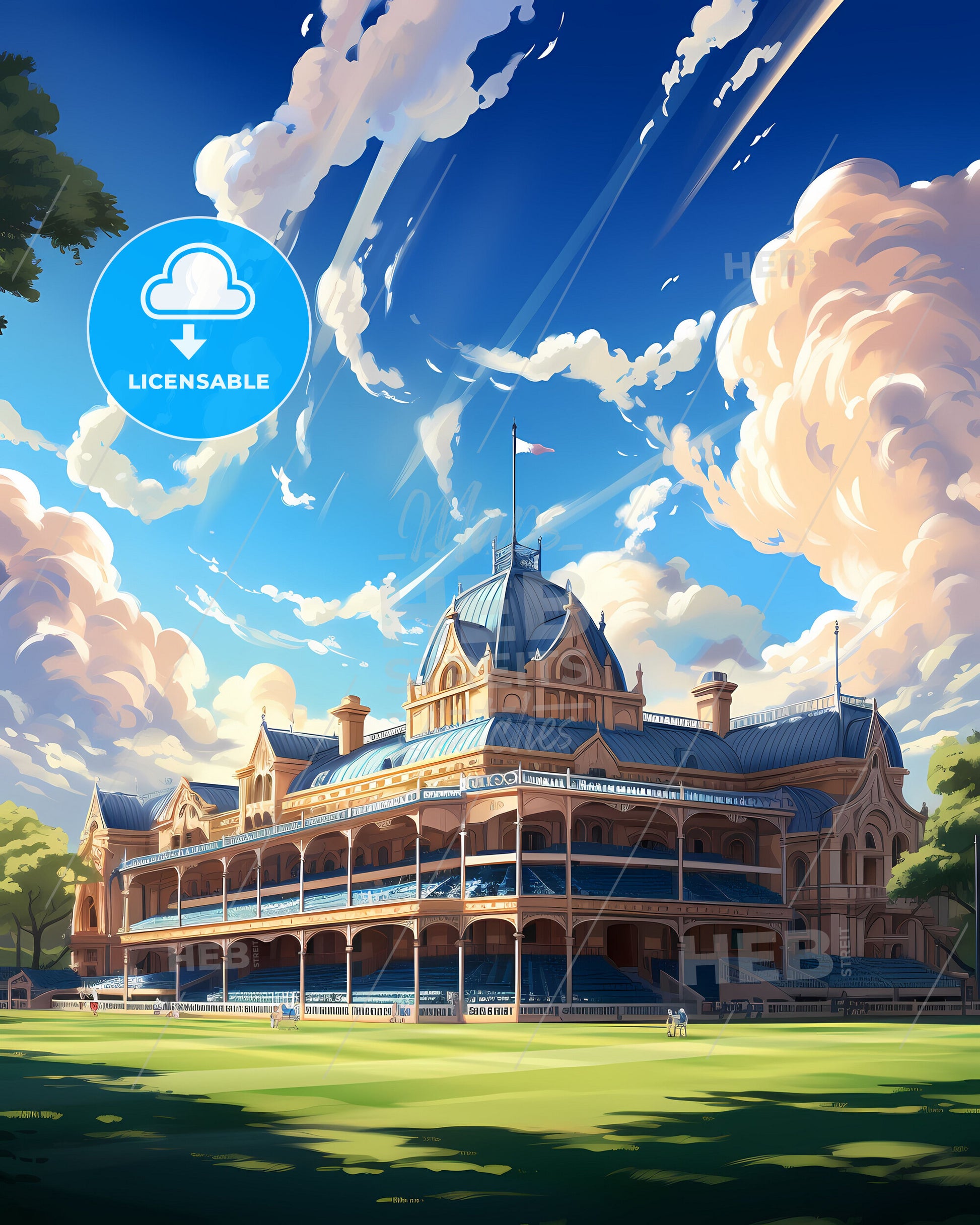 Adelaide Australia Skyline. art painting with blue sky some bright clouds in spring. in style of classic advertising illustration with nice gradients. Nice strokes and outlines. Large area of copy space on top. litte bright sparkles
