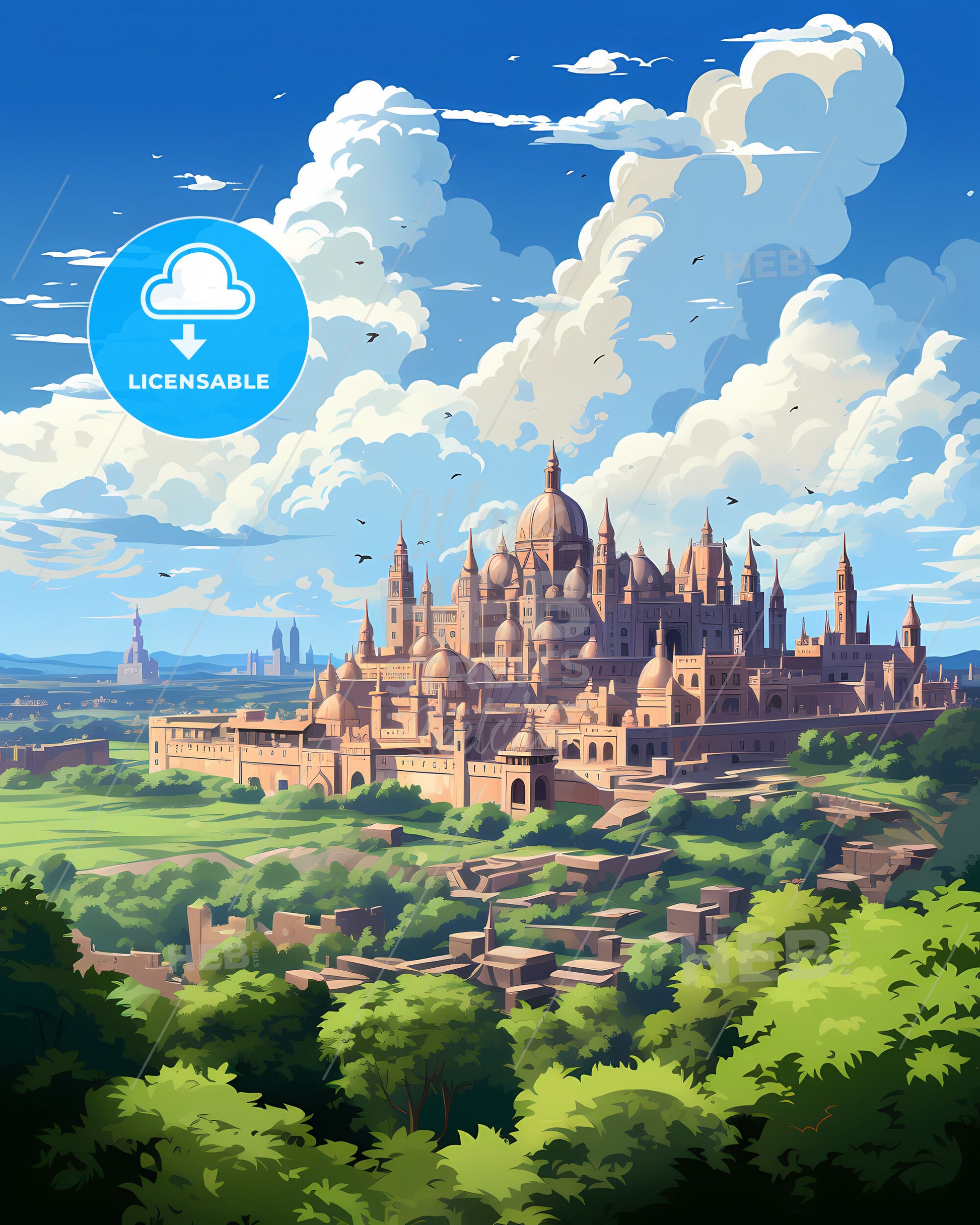 Agra India Skyline. art painting with blue sky some bright clouds in spring. in style of classic advertising illustration with nice gradients. Nice strokes and outlines. Large area of copy space on top. litte bright sparkles