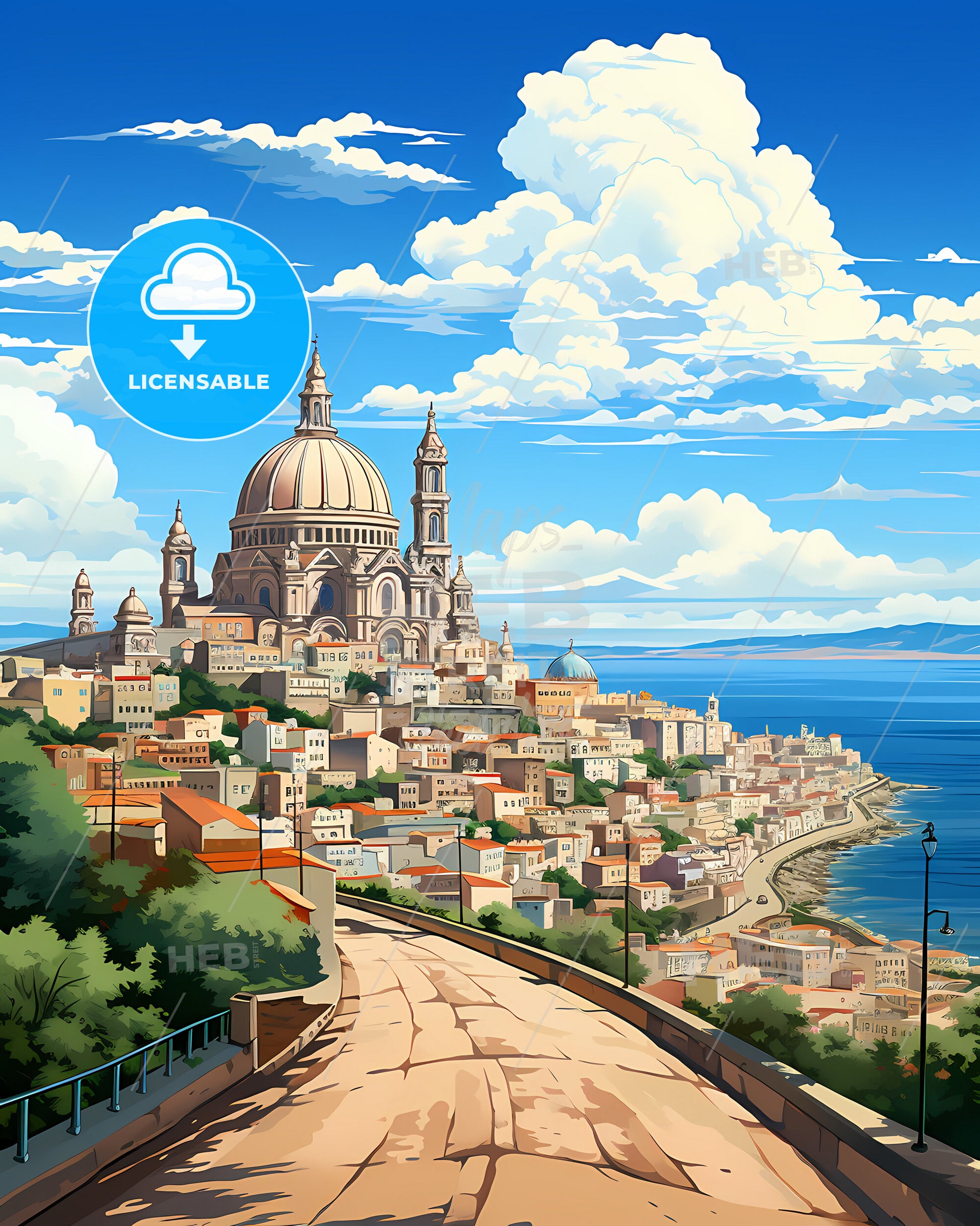 Agualva-Cacem, Lisbon, Portugal, Skyline. art painting with blue sky some bright clouds in spring. in style of classic advertising illustration with nice gradients. Nice strokes and outlines that captures the playful spirit and vivid imagination of modern art.