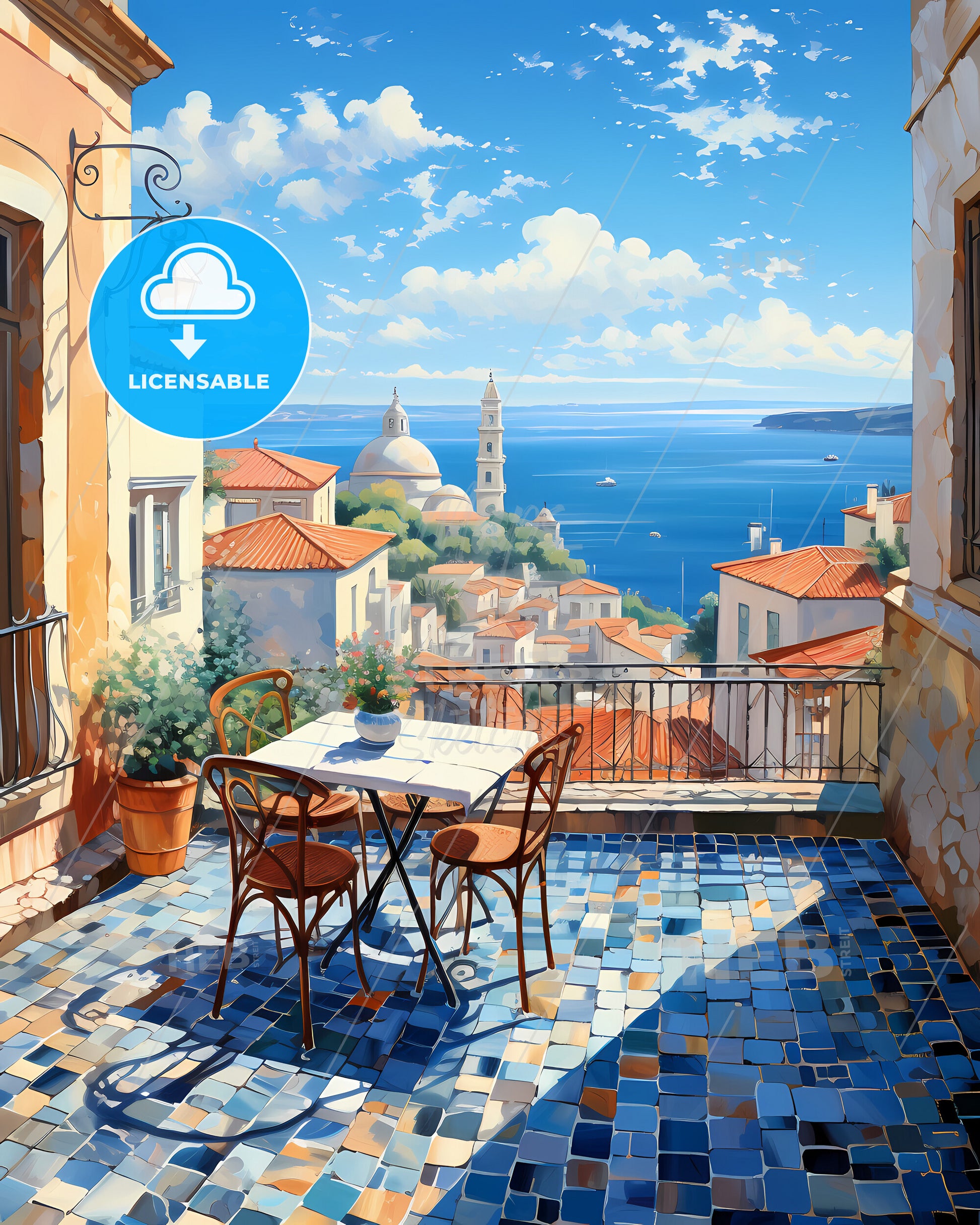 Agualva-Cacem, Lisbon, Portugal, Skyline. art painting with blue sky some bright clouds in spring. in style of classic advertising illustration with nice gradients. Nice strokes and outlines that captures the playful spirit and vivid imagination of modern art.