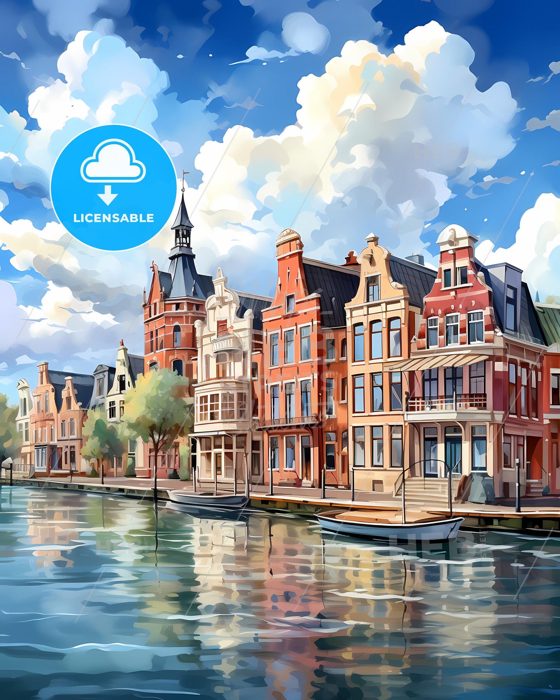 Alphen aan den Rijn, South Holland, Netherlands, Skyline. art painting with blue sky some bright clouds in spring. in style of classic advertising illustration with nice gradients. Nice strokes and outlines that captures the playful spirit and vivid imagination of modern art.