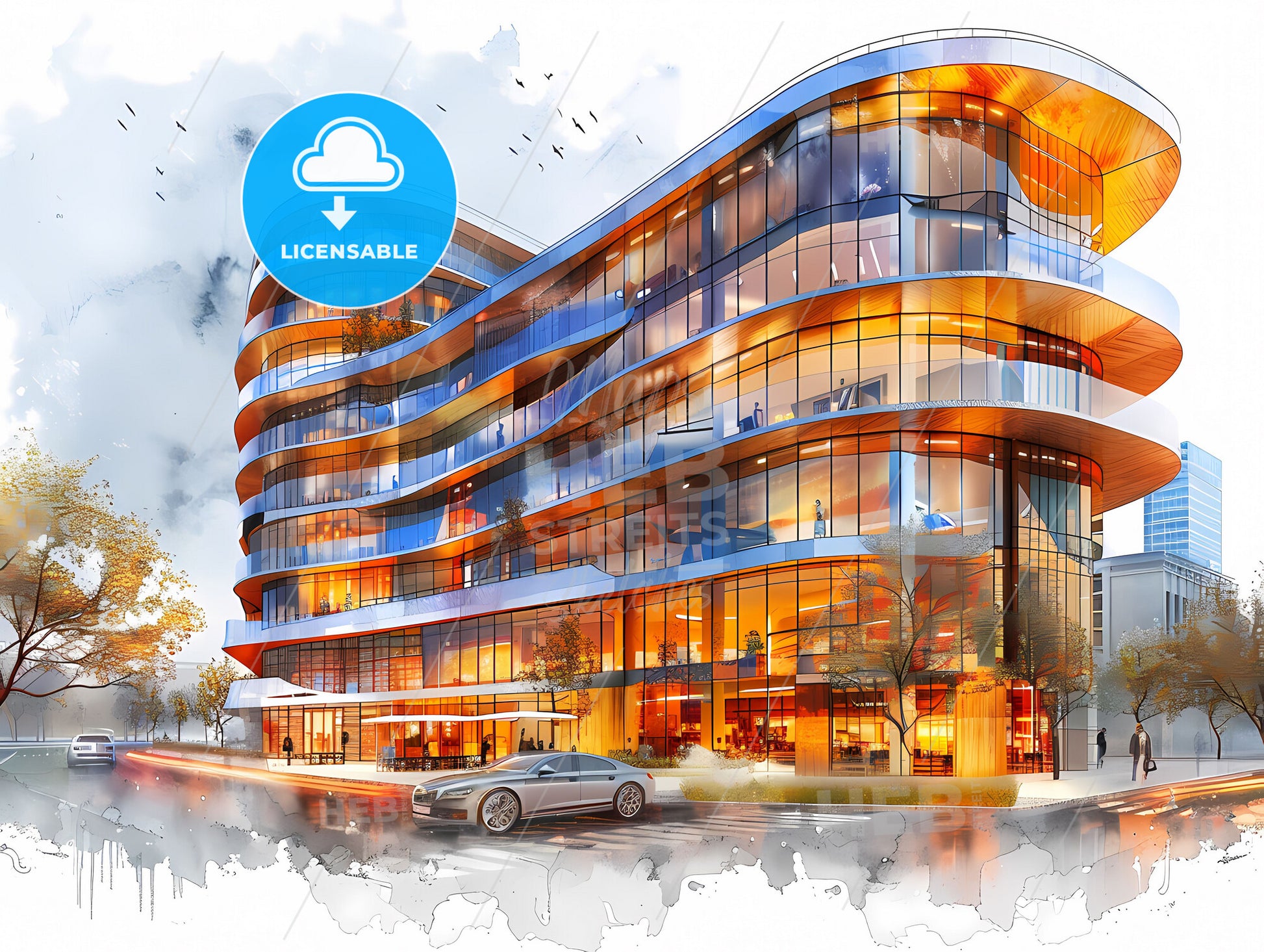 Vibrant Commercial Building Architectural Painting with Parked Cars, Ideal for T-Shirt and Art Enthusiasts