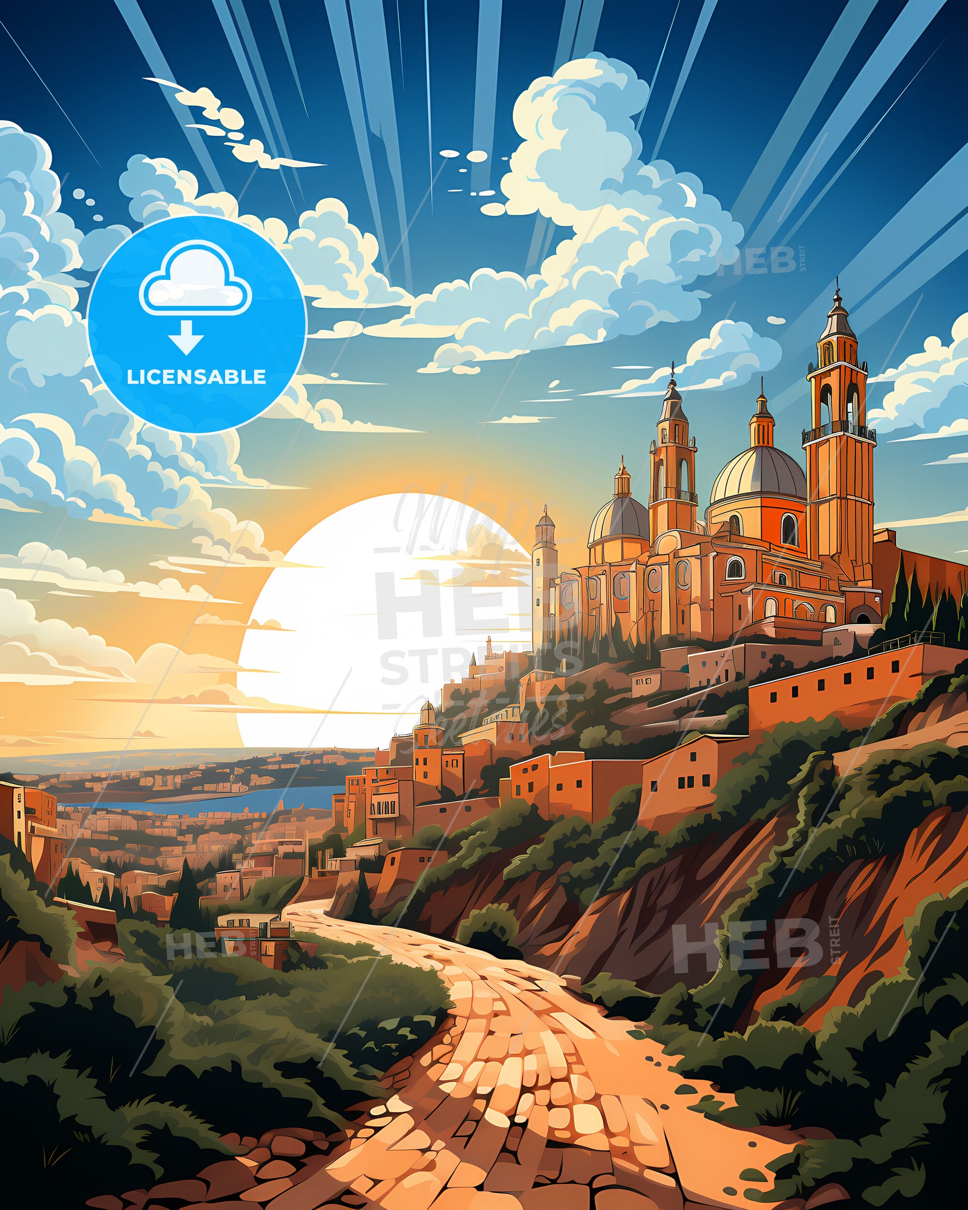 Anzio, Lazio, Italy, Skyline. art painting with blue sky some bright clouds in spring. in style of classic advertising illustration with nice gradients. Nice strokes and outlines that captures the playful spirit and vivid imagination of modern art.