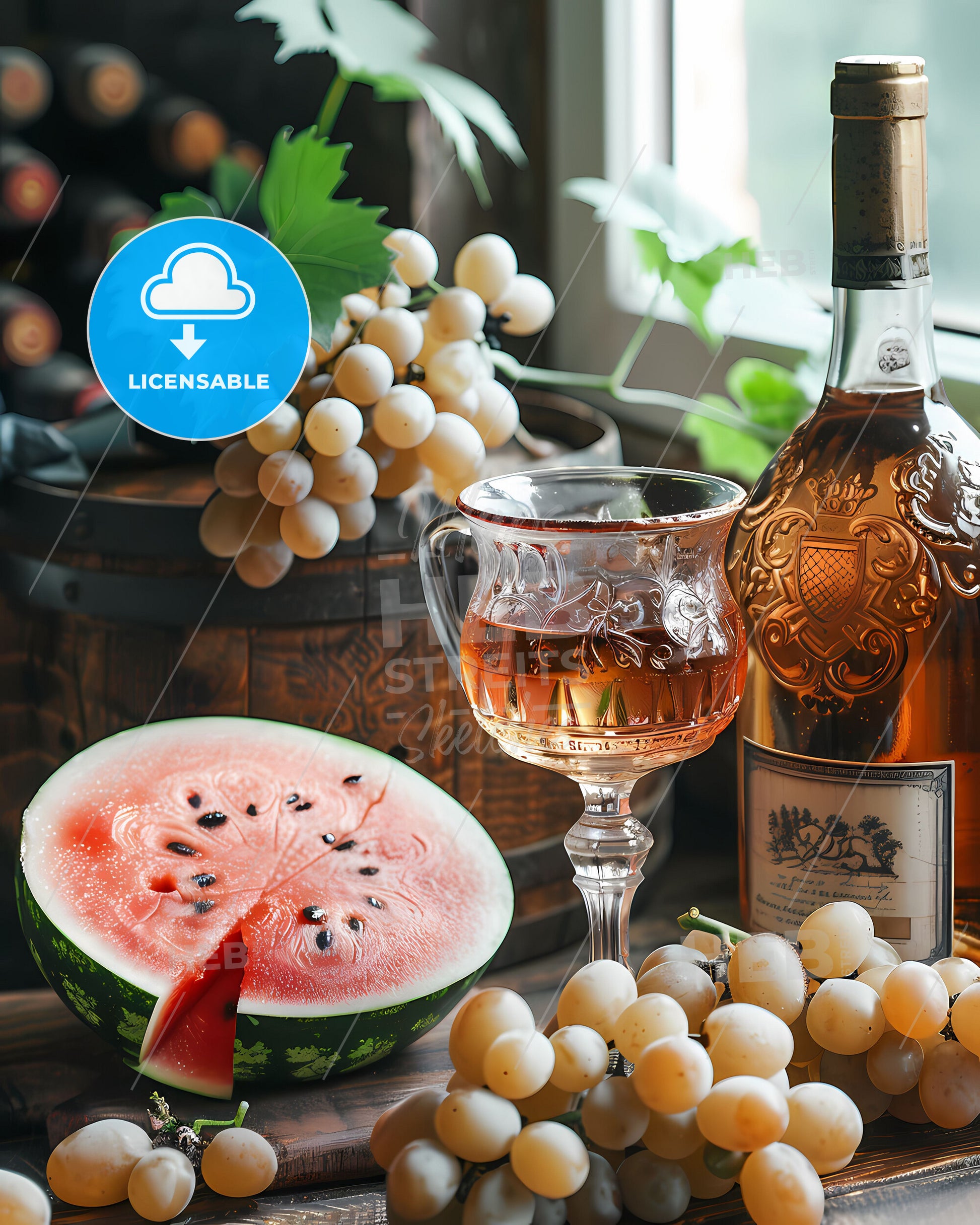 Appetizing still life on an old wooden table. A ripe juicy watermelon cut into pieces, white grapes, a bottle of collection wine of the 17th century, a glass engraved jug with kvass, a silver wine glass