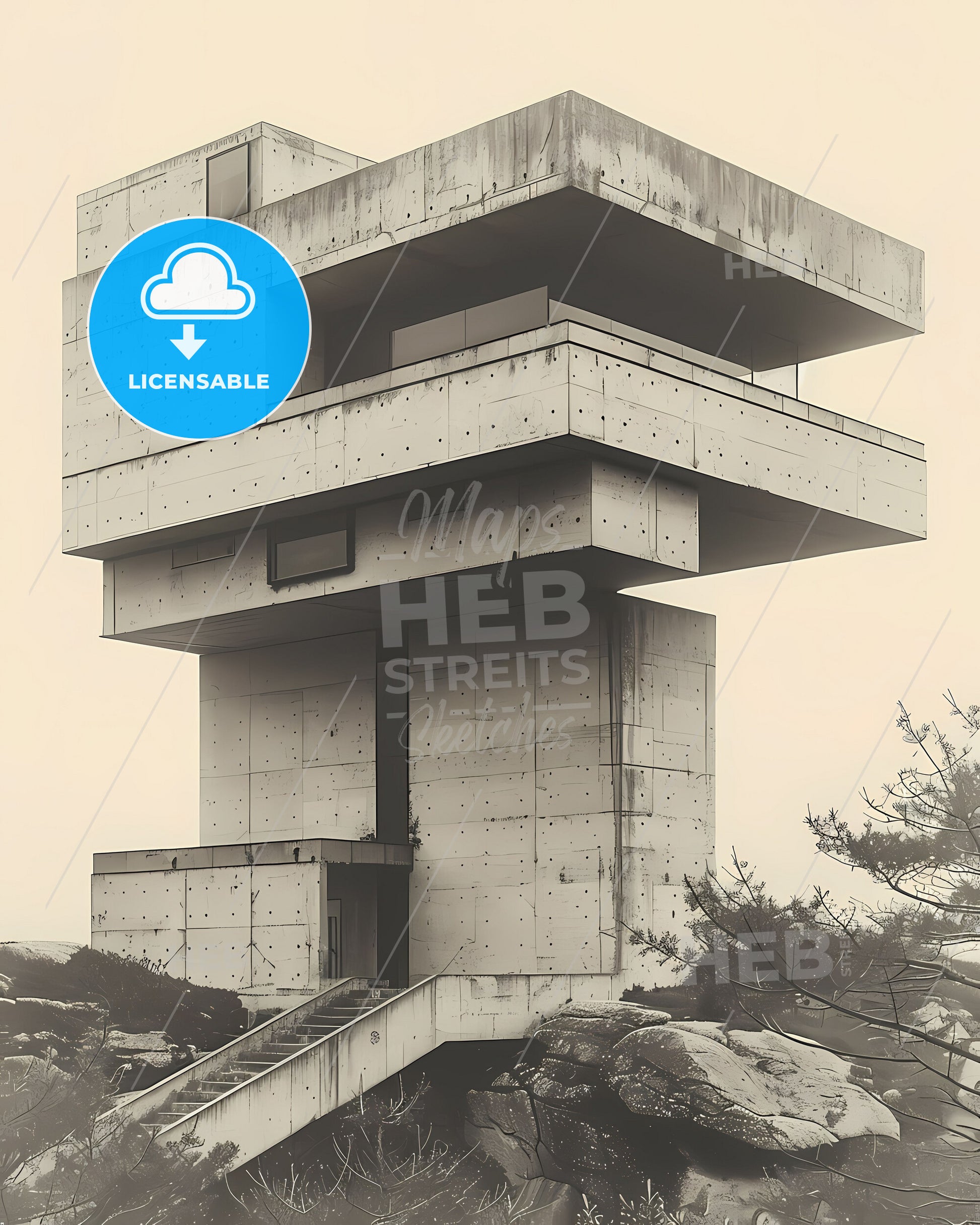 Abstract minimalist building art painting poster design with geometric shapes and vibrant colors, featuring a staircase and architectural elements