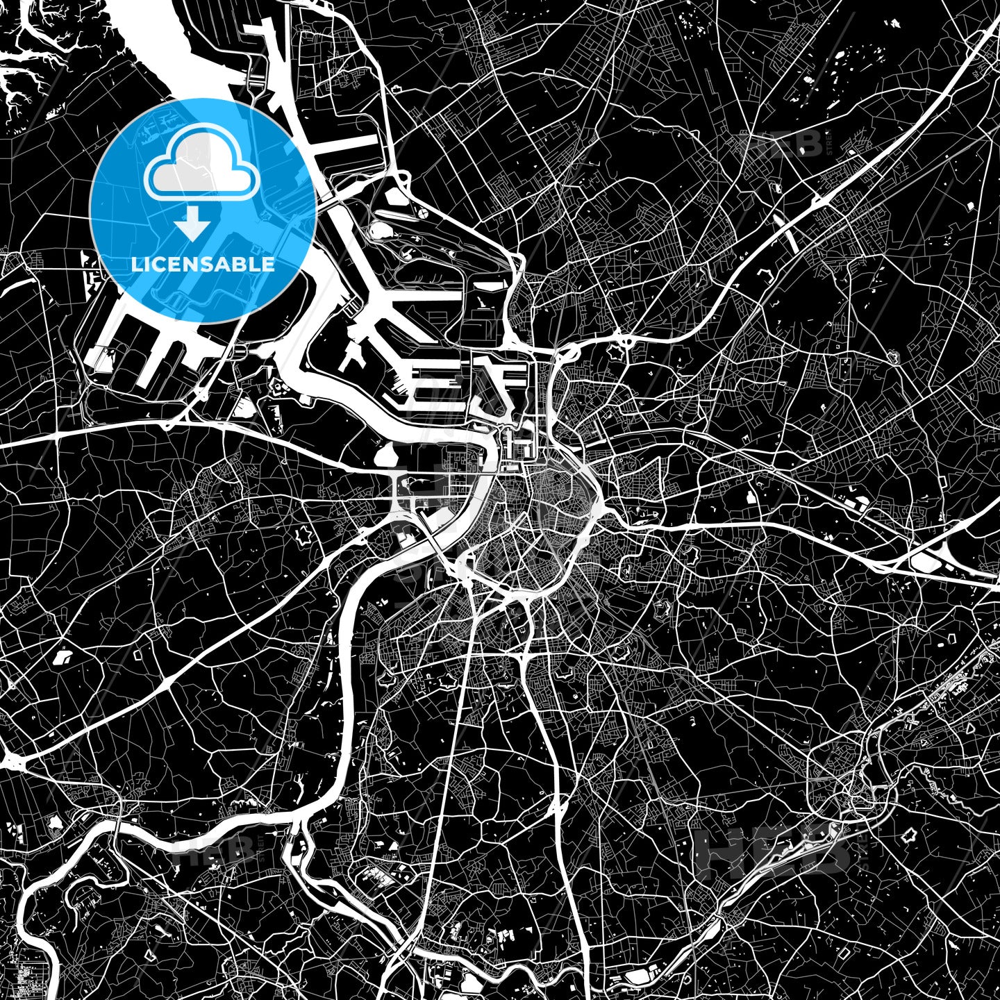 Area map of Antwerp, Belgium. Dark background version for infographic and marketing. This map of Antwerp, Flemish Region, contains streets, waterways and railways.