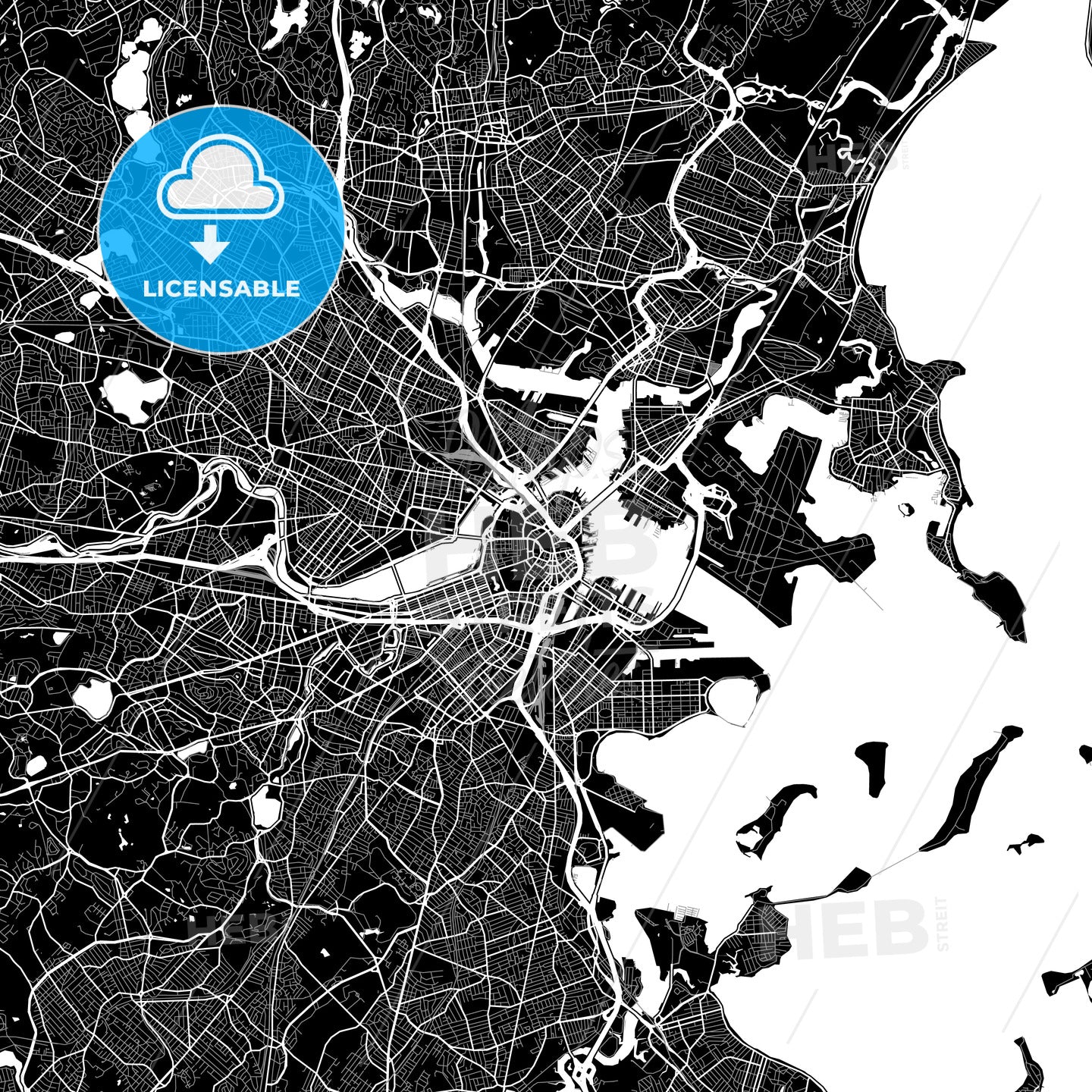 Boston, USA, area map in black and white version with many details for high zoom levels. This map of Boston contains typical landmarks for traffic with space for additional information and easy access to color changes.