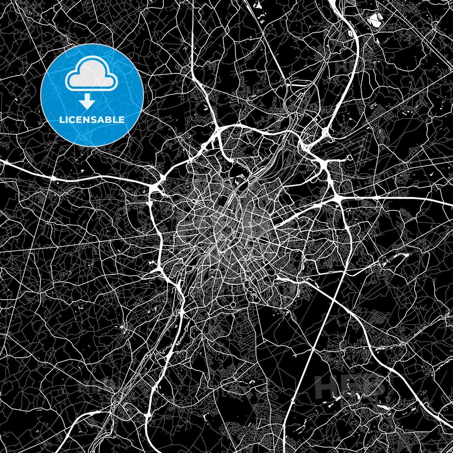Area map of Brussels, Belgium. Dark background version for infographic and marketing. This map of Brussels, Brussels-Capital Region, contains streets, waterways and railways.