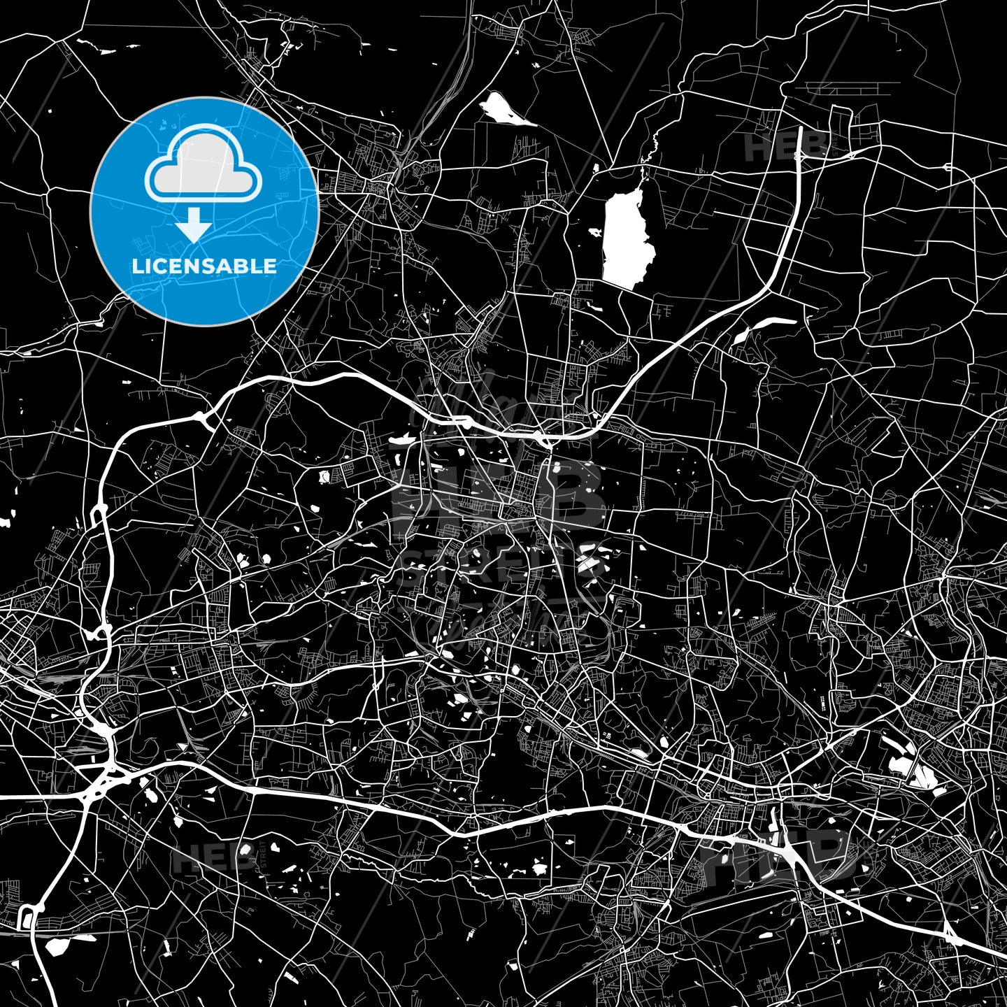 Area map of Bytom, Poland. Dark background version for infographic and marketing projects. This map of Bytom contains typical landmarks with streets, waterways and railways.