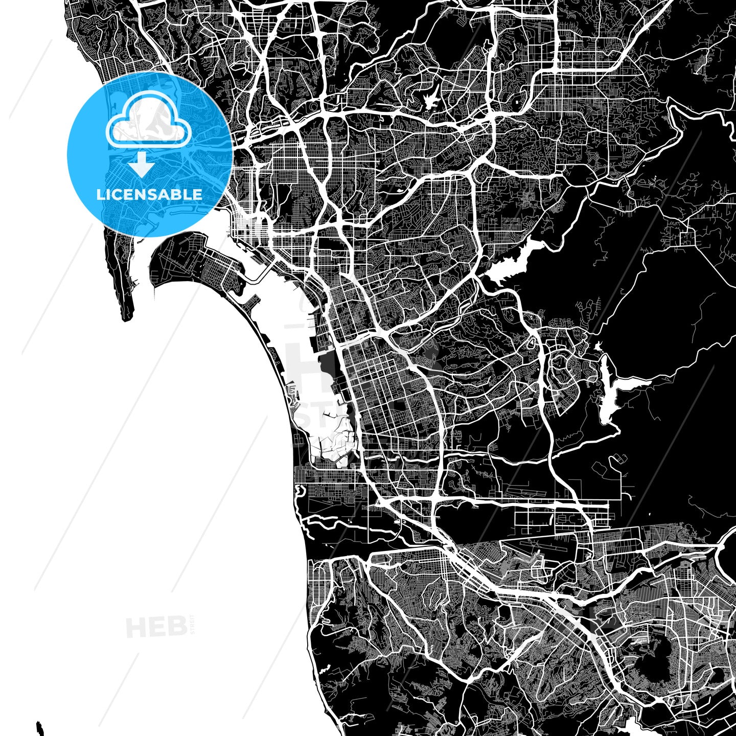 Chula Vista, USA, area map in black and white version with many details for high zoom levels. This map of Chula Vista contains typical landmarks for traffic with space for additional information and easy access to color changes.