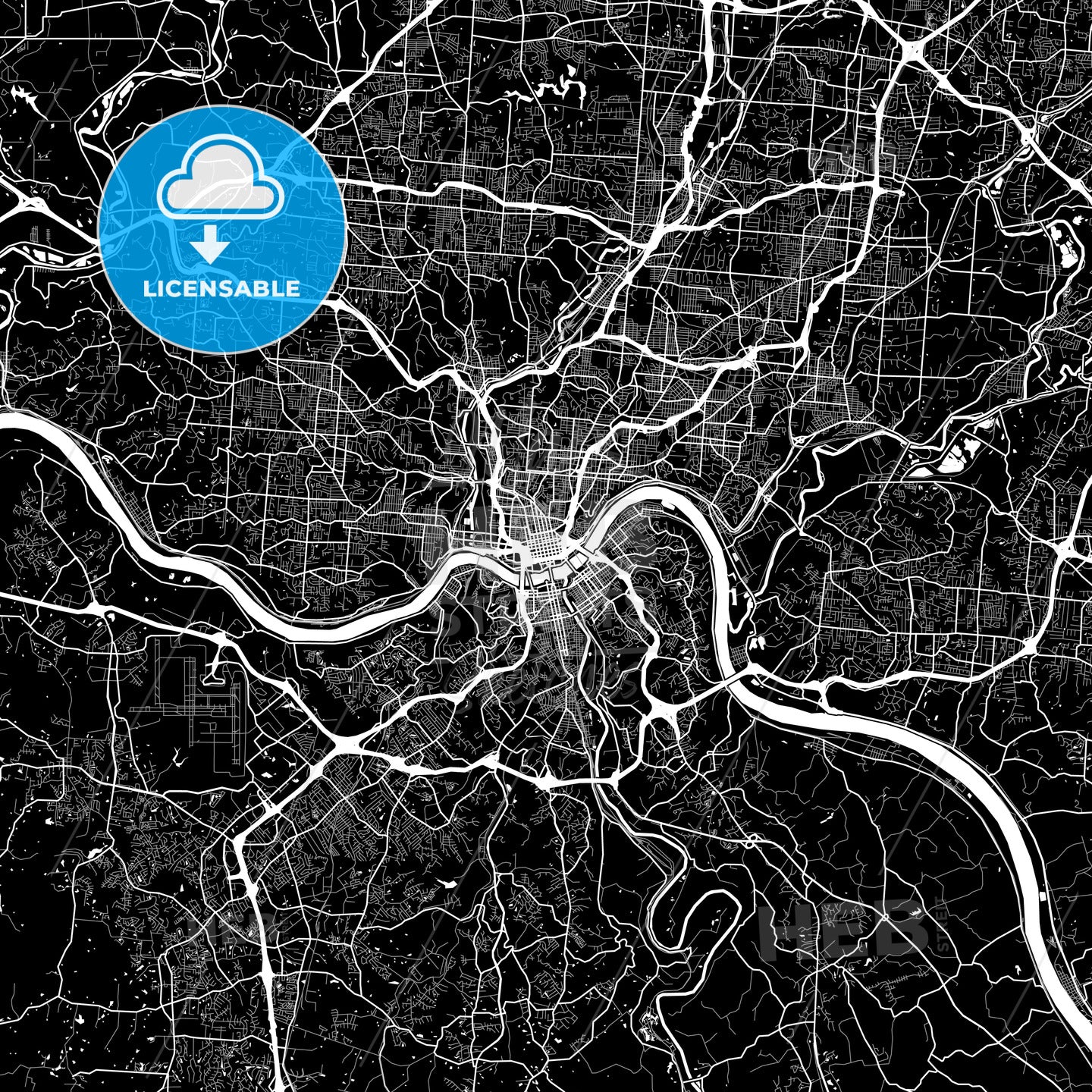 Cincinnati, USA, area map in black and white version with many details for high zoom levels. This map of Cincinnati contains typical landmarks for traffic with space for additional information and easy access to color changes.